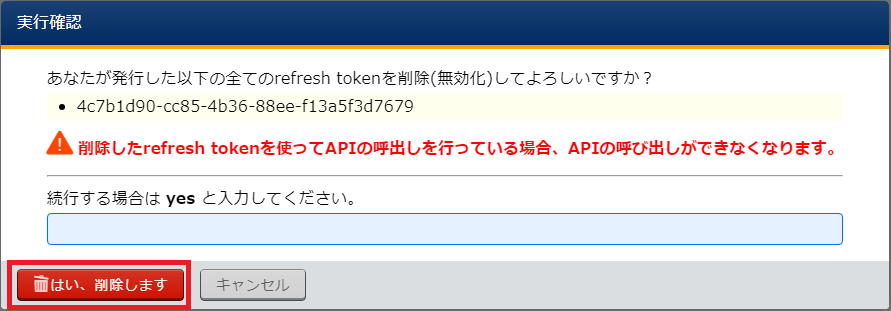 削除確認で本当に削除する場合は、yes を入力して、はい、削除します ボタンを押下します。
