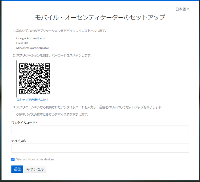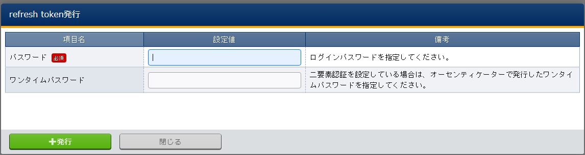 - 初めてトークンを発行する際は、発行 ボタンを押下して、必要な情報を入力しトークンを発行することができます。二要素認証を使用している場合は、二要素認証で使用しているアプリケーションのワンタイムパスワードを入力する必要があります。