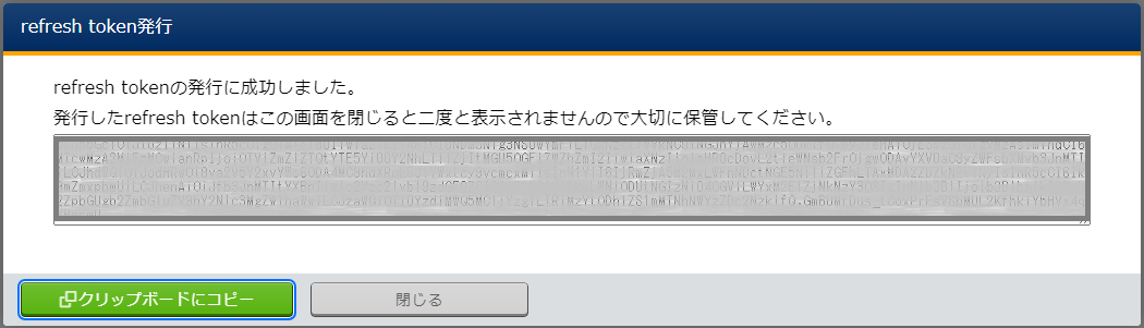 - 発行されたトークンは、再表示できませんので必ず発行結果の画面のトークンを保存する必要があります。