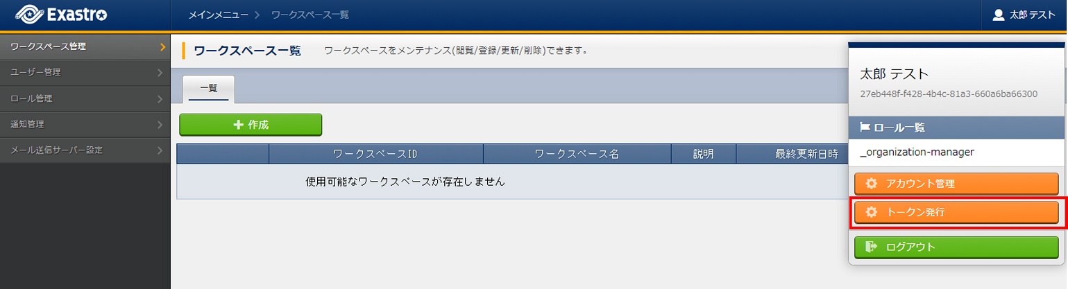 - ログインユーザーのアイコンを選択して表示されるメニューから を選択することにより、API実行に必要なトークンの発行ならびに発行したトークンの一覧表示を行うことができます。