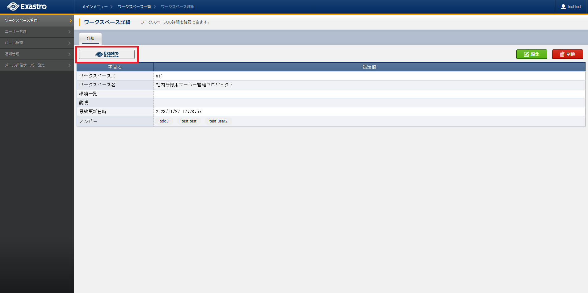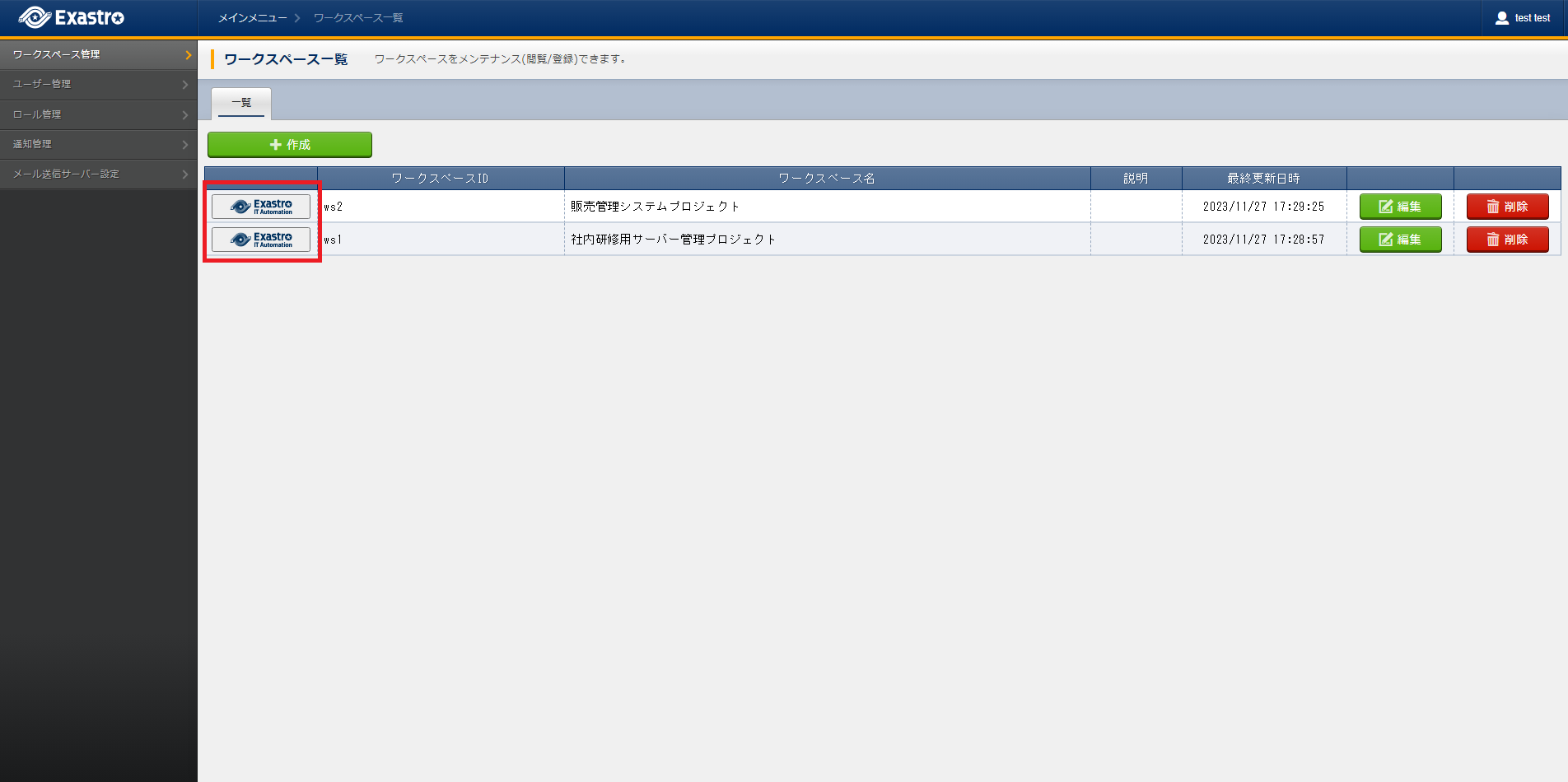 2. メインメニューへのアクセス¶ 2.1. はじめに¶ 本書は、メインメニューへのアクセス方法について記載したものです。 2.2. メインメニューへのアクセス方法¶ ログイン後に表示される、ワークスペース一覧・詳細より、メインメニューへのアクセスができます メインメニューへのアクセス 一覧の アイコンをクリックすることで、メインメニューが表示されます ワークスペース詳細の アイコンをクリックすることで、メインメニューが表示されます Tip ※ワークスペースロール(権限)がないワークスペースは表示されません 前のトピックへ1. ログイン方法 次のトピックへ3. メインメニュー(DashBoard) ↑ Page Top