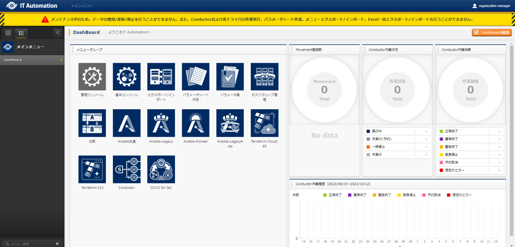 以下の例のように、execute_countが0になった後に「読み取り専用モード」をONに設定することを推奨します。< HTTP/1.1 200 OK < Date: Tue, 10 Oct 2023 07:59:09 GMT < Content-Type: application/json < Content-Length: 2449 < Connection: keep-alive < { [data not shown] * Connection #0 to host platform-auth left intact { "data": { "execute_count": 0, # システム全体でのステータス「準備中」「実行中」「実行中(遅延)」対象のカウント(ita-by-conductor-synchronizeを含まない) "organizations": [ { "id": "Organization_01", # システム上のオーガナイゼーション "execute_count": 0, # オーガナイゼーション単位でのステータス「準備中」「実行中」「実行中(遅延)」対象のカウント(ita-by-conductor-synchronizeを含まない) "workspaces": [ { "id": "Workspace_01", # オーガナイゼーション上のワークスペース "execute_count": 0, # ワークスペース単位でのステータス「準備中」「実行中」「実行中(遅延)」対象のカウント(ita-by-conductor-synchronizeを含まない) "backyards": { # 各バックヤード機能でステータスが「準備中」「実行中」「実行中(遅延)」の対象がある場合、対象のID, 最終更新日時, ステータスID, ステータス名称が格納されます "ita-by-ansible-execute": [], "ita-by-conductor-synchronize": [ { "id": "6b9743ab-73fd-49e9-b20b-910f00546827", "last_update_timestamp": "2023-10-10T16:55:04.053156Z", "status_id": "3", "status_name": "実行中" }, { "id": "9b8ab1d7-b2f7-4e78-8529-e79b63ce495b", "last_update_timestamp": "2023-10-10T16:50:02.175727Z", "status_id": "3", "status_name": "実行中" } ], "ita-by-excel-export-import": [], "ita-by-menu-create": [], "ita-by-menu-export-import": [], "ita-by-terraform-cli-execute": [], "ita-by-terraform-cloud-ep-execute": [] } } ] }, { "id": "Organization_02", # システム上のオーガナイゼーション "execute_count": 0, # オーガナイゼーション単位でのステータス「準備中」「実行中」「実行中(遅延)」対象のカウント(ita-by-conductor-synchronizeを含まない) "workspaces": [ { "id": "Workspace_01", # オーガナイゼーション上のワークスペース "execute_count": 0, # ワークスペース単位でのステータス「準備中」「実行中」「実行中(遅延)」対象のカウント(ita-by-conductor-synchronizeを含まない) "backyards": { "ita-by-ansible-execute": [], "ita-by-conductor-synchronize": [], "ita-by-excel-export-import": [], "ita-by-menu-create": [], "ita-by-menu-export-import": [], "ita-by-terraform-cli-execute": [], "ita-by-terraform-cloud-ep-execute": [] } }, { "id": "Workspace_02", # オーガナイゼーション上のワークスペース "execute_count": 0, # ワークスペース単位でのステータス「準備中」「実行中」「実行中(遅延)」対象のカウント(ita-by-conductor-synchronizeを含まない) "backyards": { # 各バックヤード機能でステータスが「準備中」「実行中」「実行中(遅延)」の対象がある場合、対象のID, 最終更新日時, ステータスID, ステータス名称が格納されます "ita-by-ansible-execute": [], "ita-by-conductor-synchronize": [], "ita-by-excel-export-import": [], "ita-by-menu-create": [], "ita-by-menu-export-import": [], "ita-by-terraform-cli-execute": [], "ita-by-terraform-cloud-ep-execute": [] } } ] } ] }, "message": "SUCCESS", "result": "000-00000", "ts": "2023-10-10T07:59:05.079Z" }