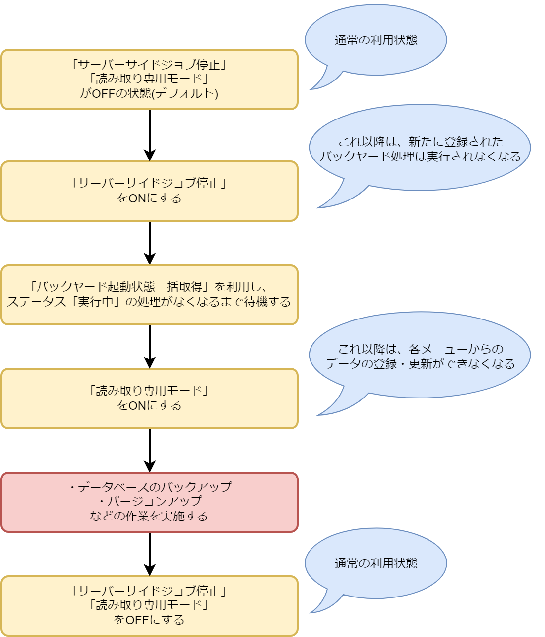 という手順を踏むことで、データベースのバックアップやバージョンアップを実行する前に、動作中のバックヤード処理を無くすことができます。