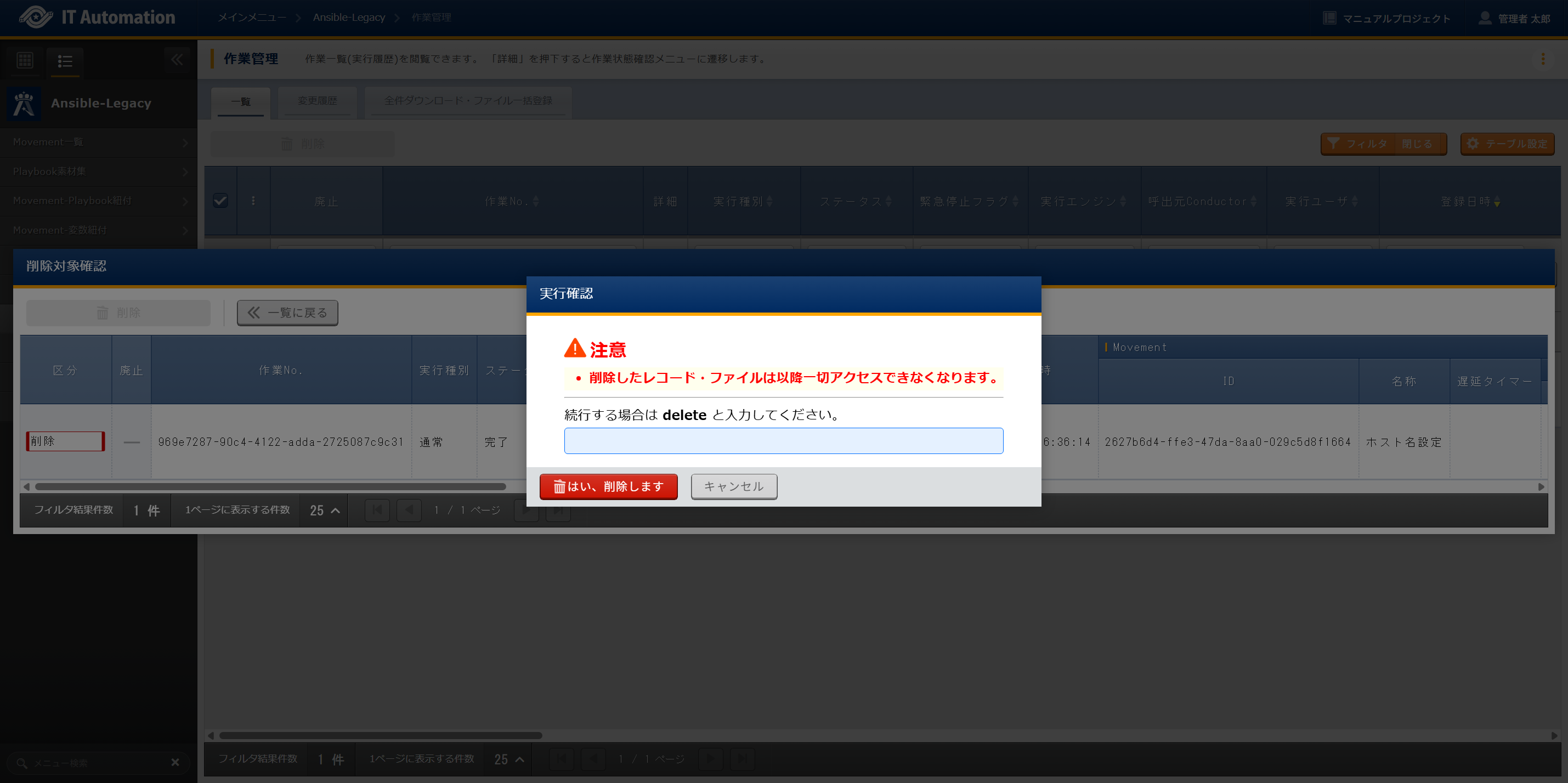 押下後、削除の実行確認が表示されます。