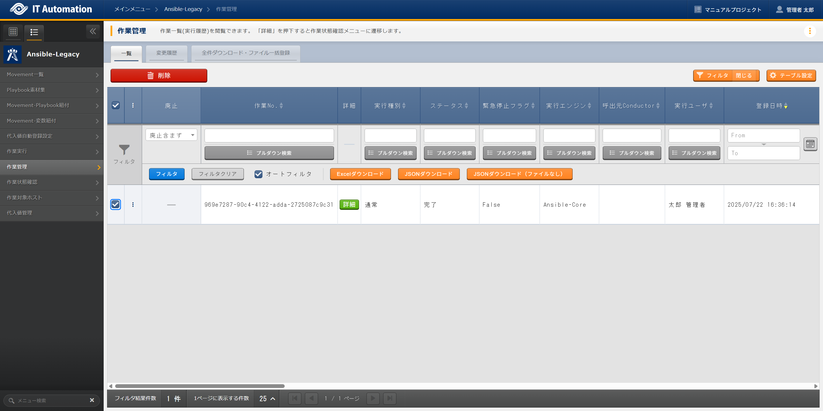 該当情報の削除は、該当メニューを選択して、フィルタやデフォルト表示された一覧から、削除対象となる情報を選択して削除します。