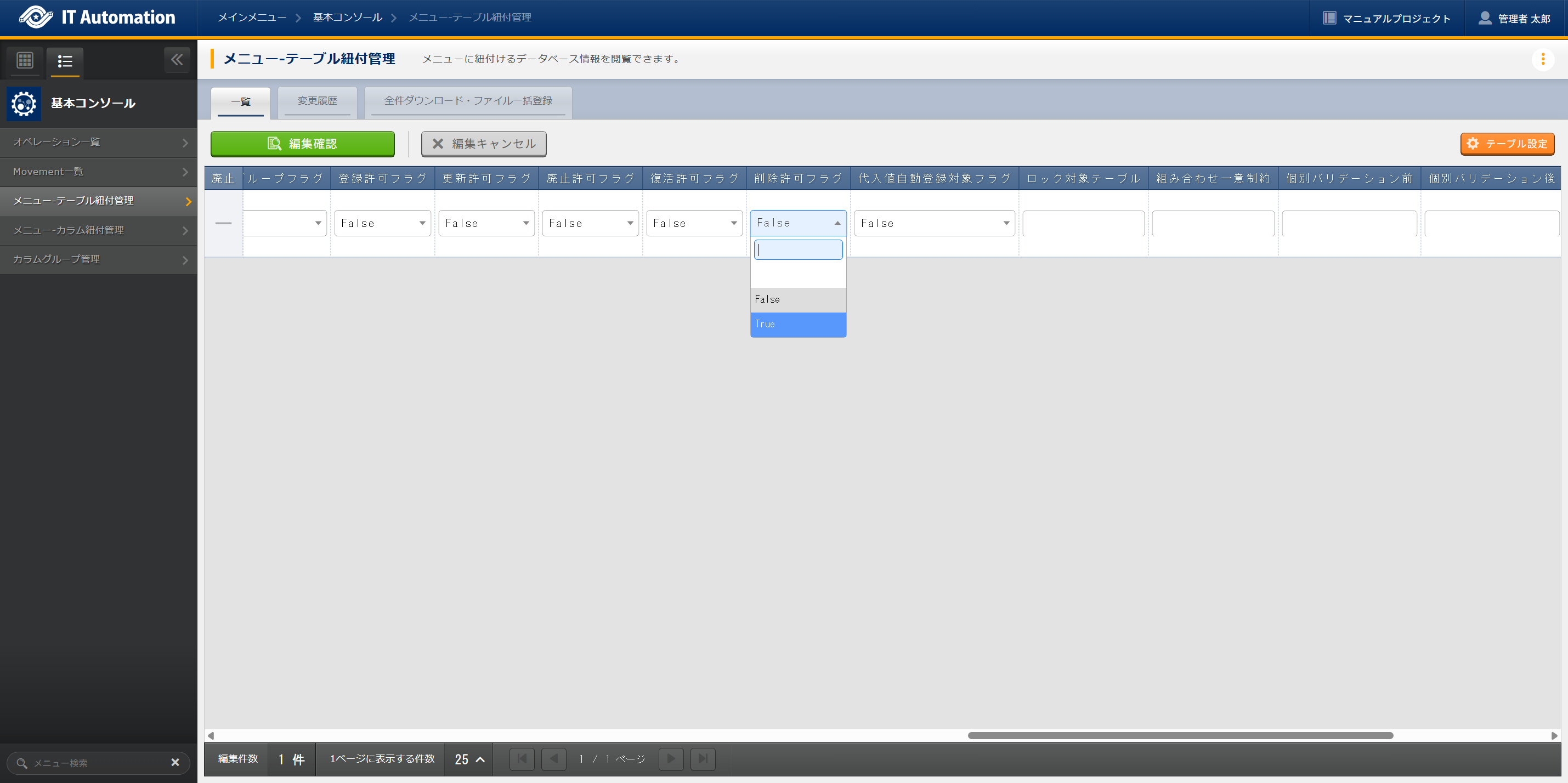 また、削除対象となるメニューについては、 から削除許可フラグを 有効(True) にする必要があります。