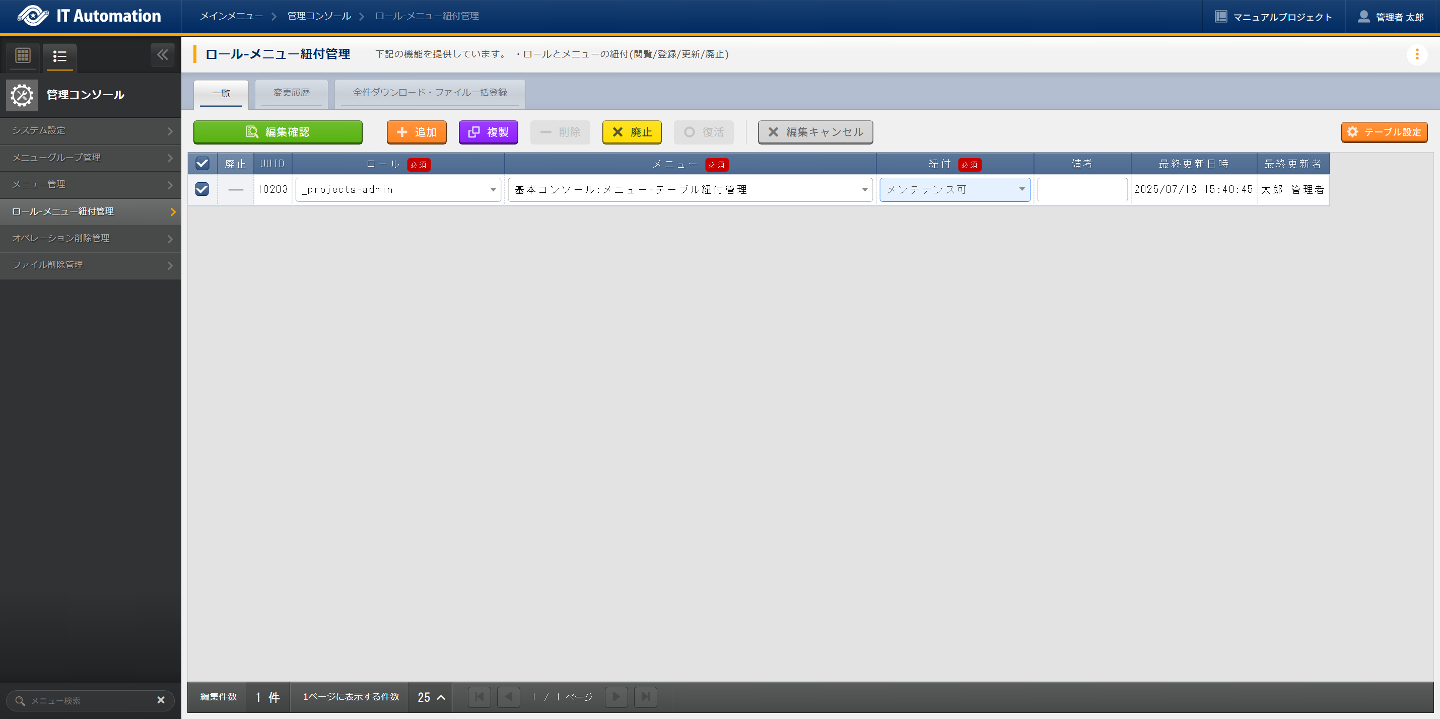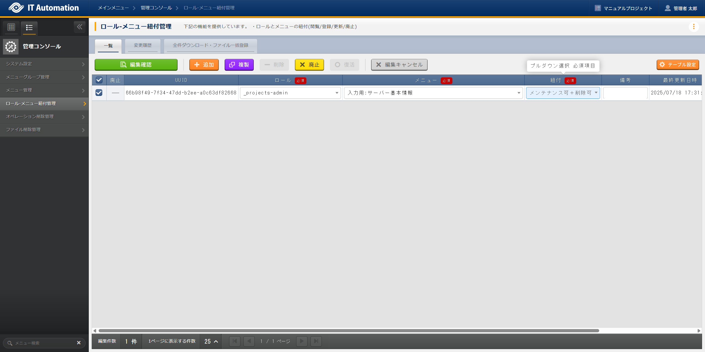 削除できるユーザーは、 で設定したメニューの紐付 メンテナンス+削除可 となっているロールのユーザーとなります。