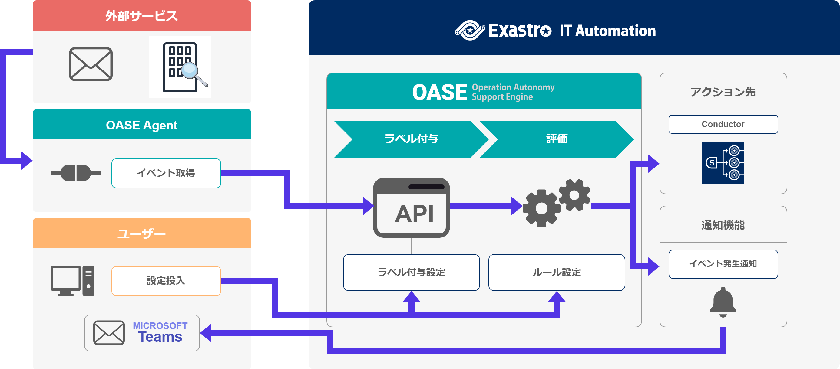 OASEとは、外部から取得したイベント情報を分析し、そのイベントへの対処の自動化を支援する機能です。