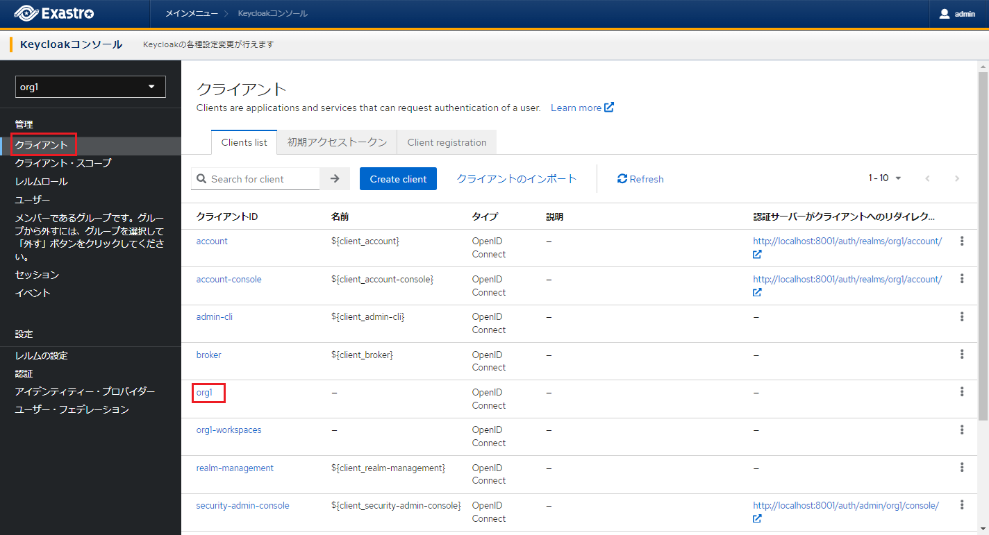 - クライアント(オーガナイゼーションIDと同じ値)選択上述の レルム(オーガナイゼーション)選択 で目的のレルムを選択し、メニューから を選択します。画面が表示されるので、 クライアントID列から オーガナイゼーションIDと同じ値のクライアント を選択します。