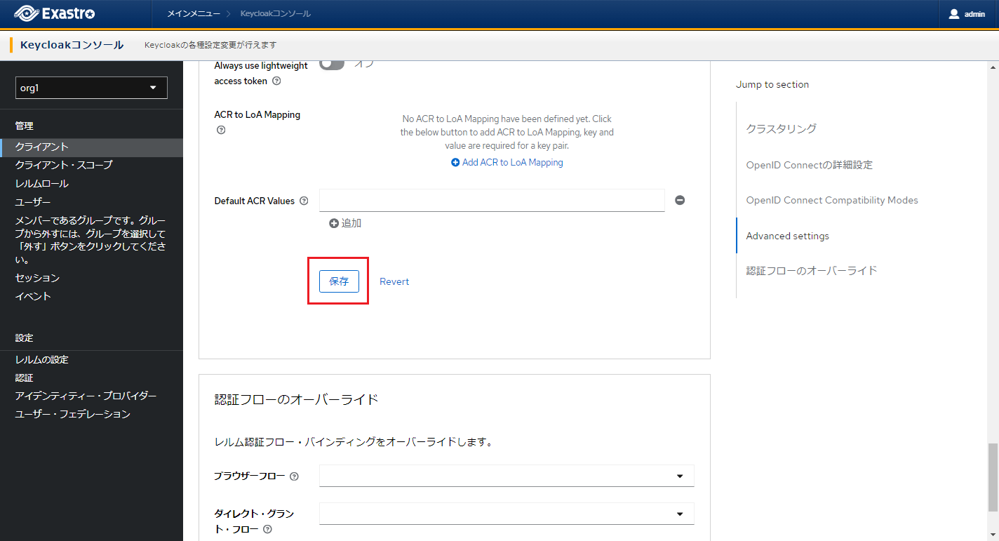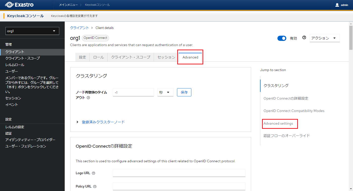 - Advanced settings(クライアント)の表示画面が表示されるので、 を選択し、Advanced画面の右側 Jump to section から、Advanced settings を選択します。