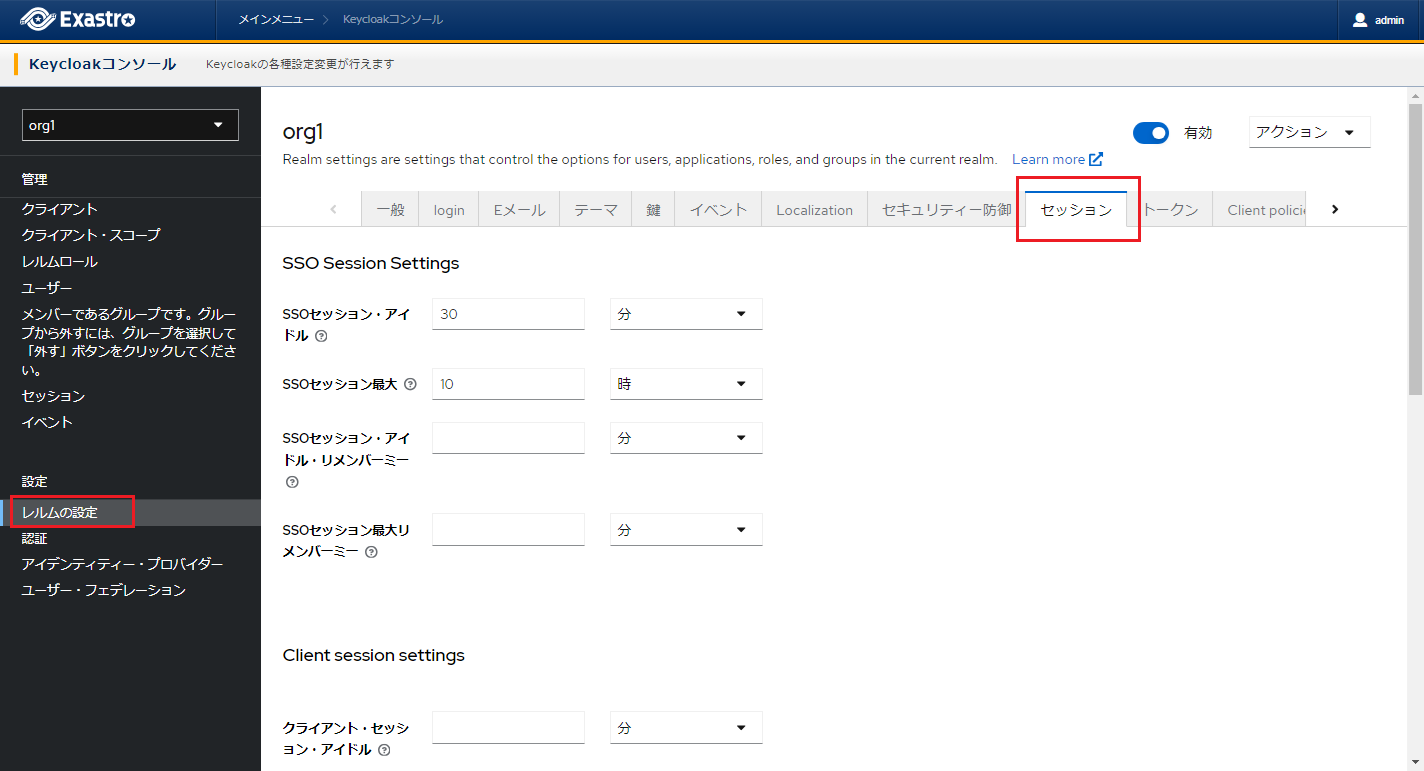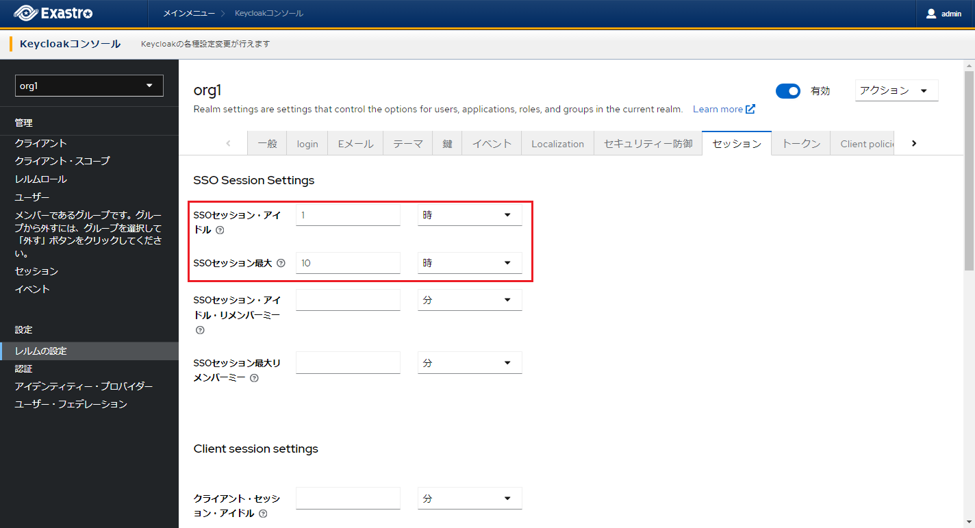 アクセストークンは、SSOセッション・アイドル/SSOセッション最大に指定した時間を過ぎると、生存期間内であってもトークンが無効化されます。SSOセッションのデフォルト設定、SSOセッション・アイドル(30分)/SSOセッション最大(10時間) を超える時間が、アクセストークン生存期間に必要な場合は、あわせて SSOセッション・アイドル/SSOセッション最大 の時間も変更を行ってください。