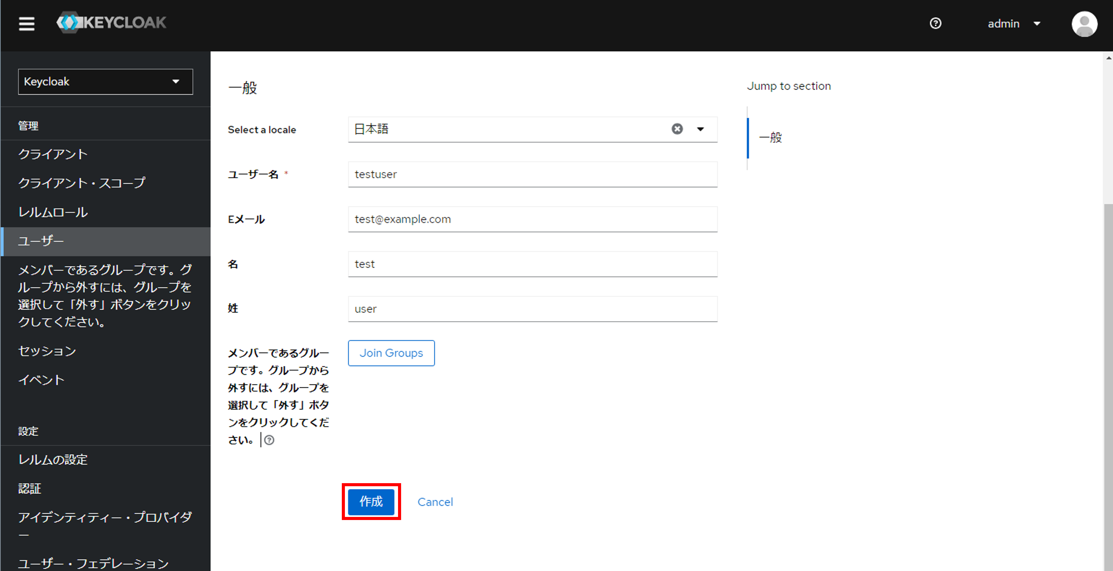 必要なユーザー・アクション次回ログインした際に、どのような情報を設定するか設定できます詳しい設定値は、Keycloakの公式ドキュメント をご参照くださいEメールが確認済みOFFを選択します※ONを選択してもメール送信用サーバー設定が設定されていないと動作しませんSelect a location言語を選択しますユーザー名ログイン時に使用するユーザー名を入力しますEメール追加するユーザーのE-mailアドレスを入力します名追加するユーザーの名を入力します性追加するユーザーの姓を入力しますJoin GroupsExastro システムでは未対応のため、指定しないでください - システム管理者のユーザー登録必要な情報を入力後、 作成 ボタンを押下して、ユーザーを登録することができます。