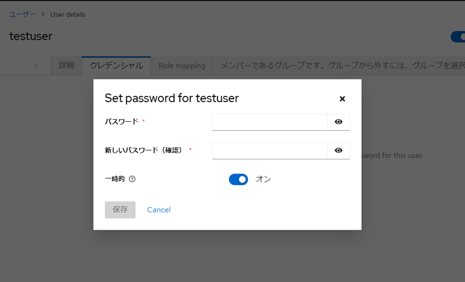 - 追加したユーザーのパスワード設定ユーザーの登録ではパスワードの設定ができていないため、登録後次の画面からパスワードを設定する必要があります。ユーザー詳細の を選択し、パスワードを設定してください。ボタンからパスワードを入力後、保存 ボタンを押下してパスワード設定します。