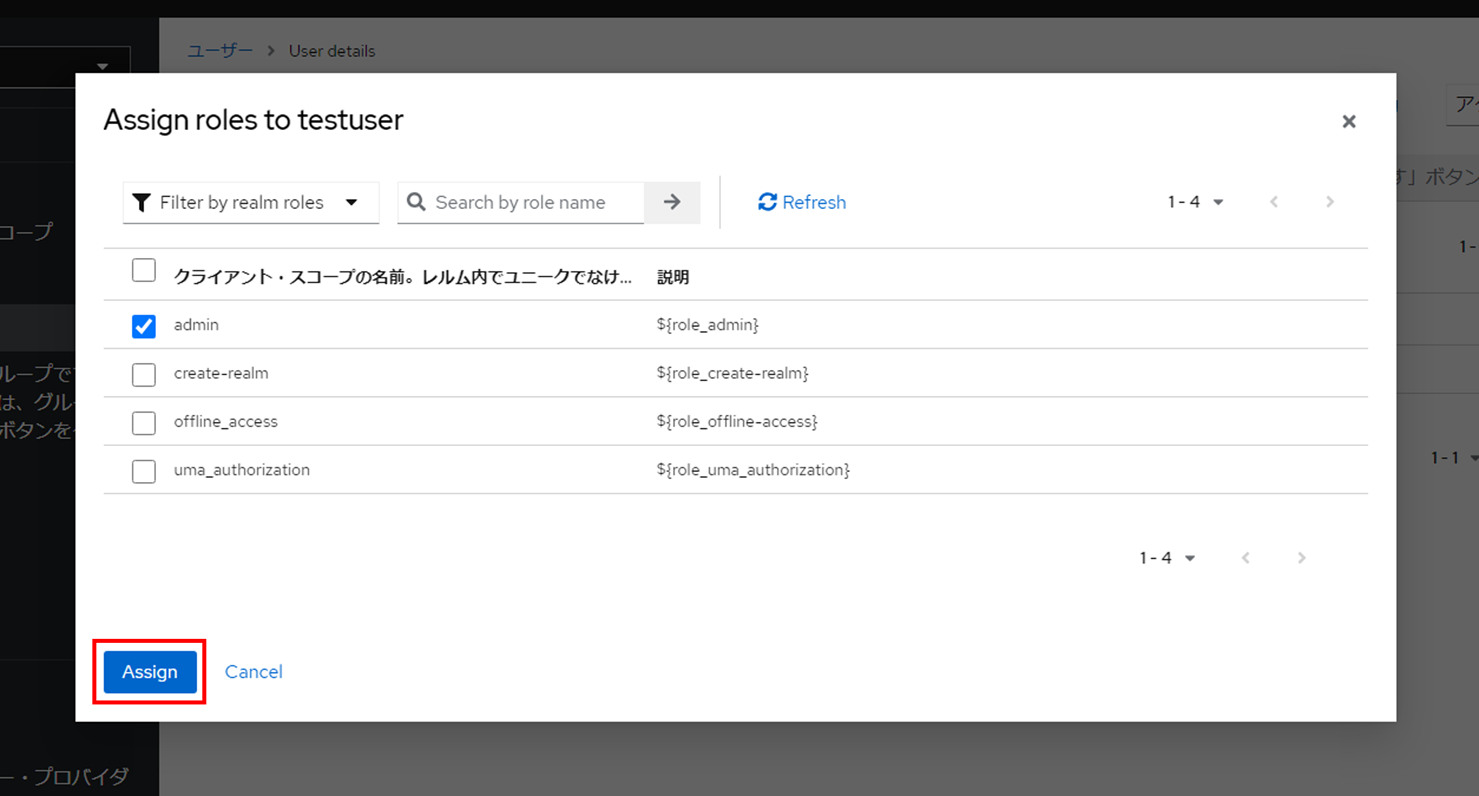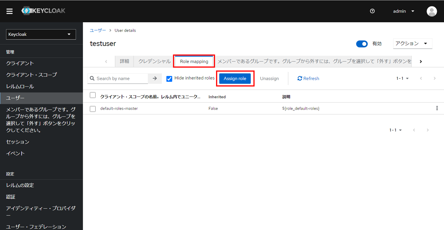 パスワードログイン時に使用するパスワードを入力します新しいパスワード(確認)入力したパスワードと同じ内容を入力します一時的オンに設定した際、次回ログイン時にパスワード変更画面が表示されます通常はオンのままご利用ください - 追加したユーザーのロール設定追加したユーザーに必要なRoleを割り当てすることで、システム管理者と同等の設定が行えるようになります。ユーザー詳細の を選択し、ロールを設定してください。ボタンからロールを選択した後、Assign ボタンを押下してアサインします。