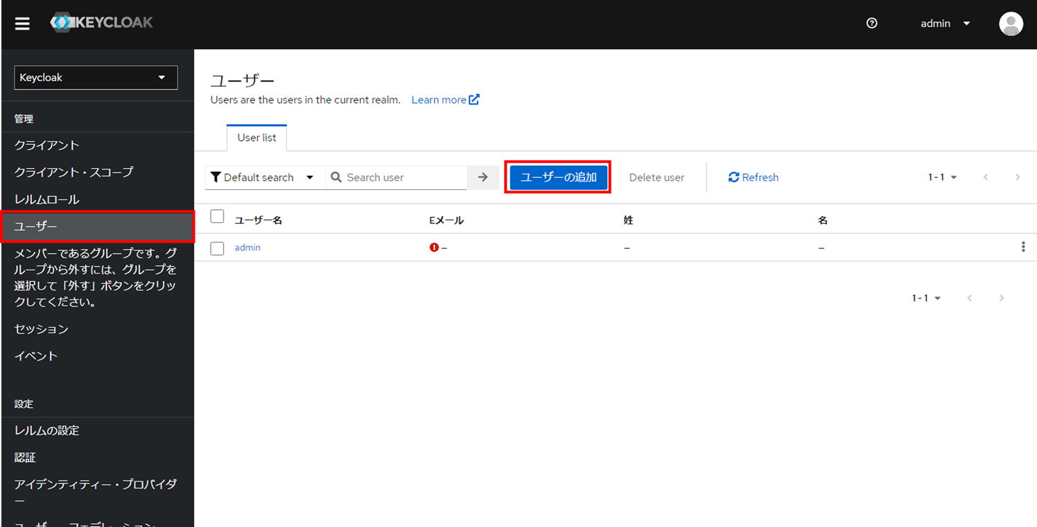- システム管理者の追加システム管理者を追加する際に、上述のレルムで master を選択し、メニューから を選択後、 ユーザーの追加 ボタンを押下して、ユーザーを追加(情報入力)することができます。
