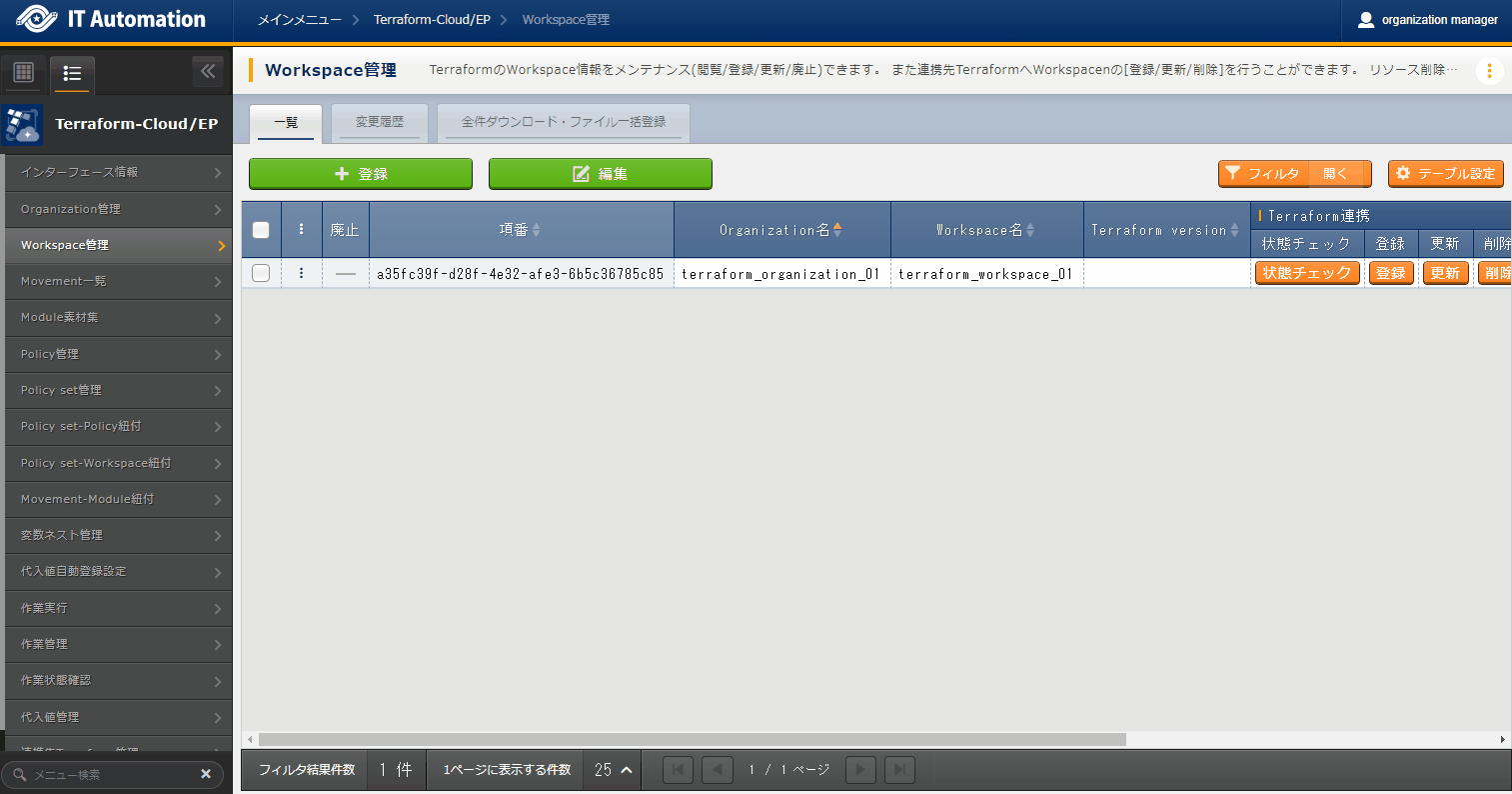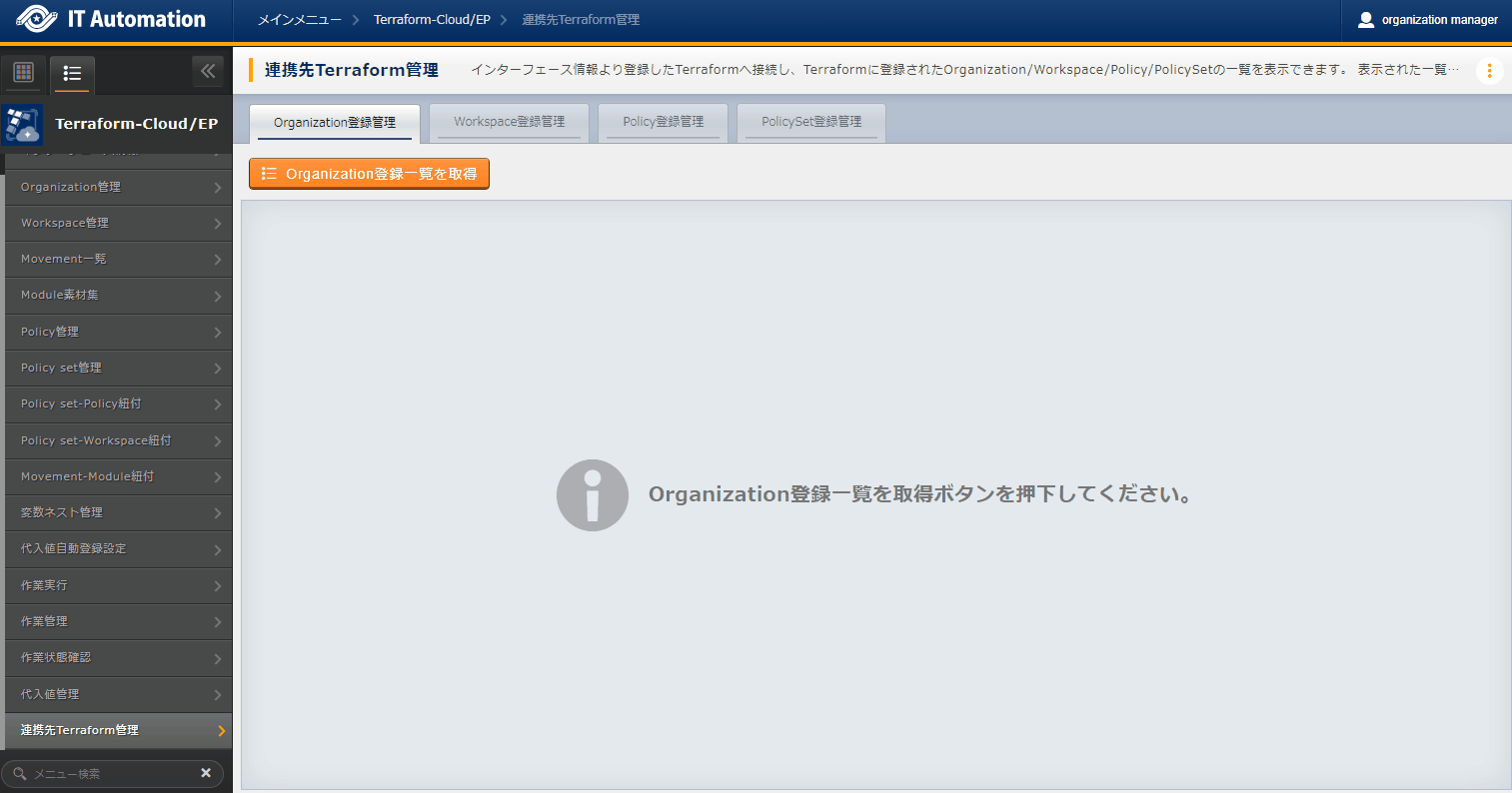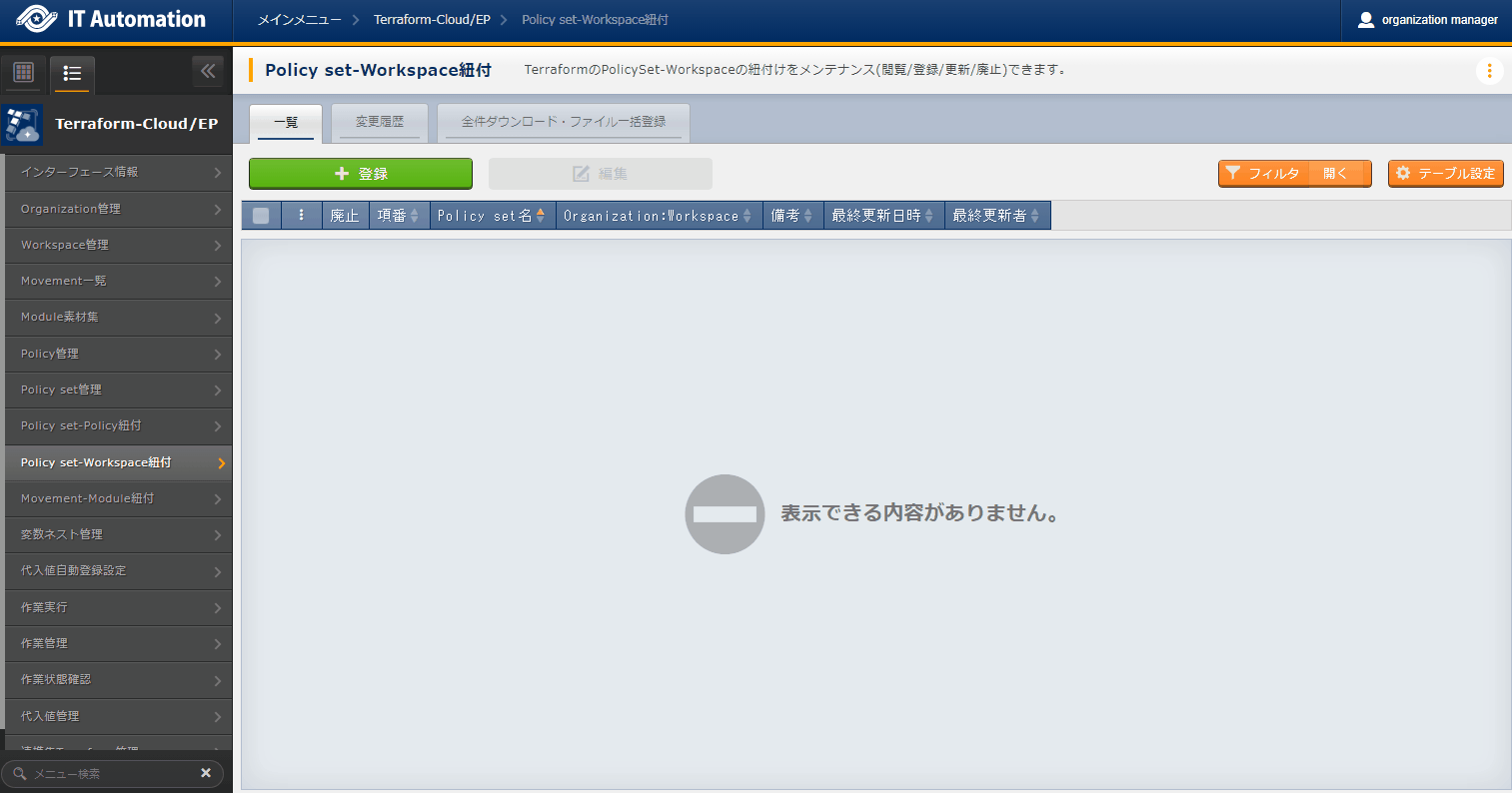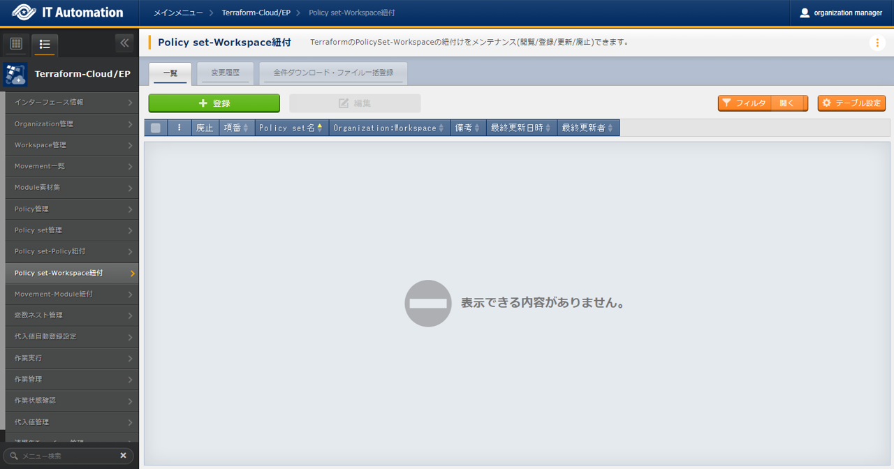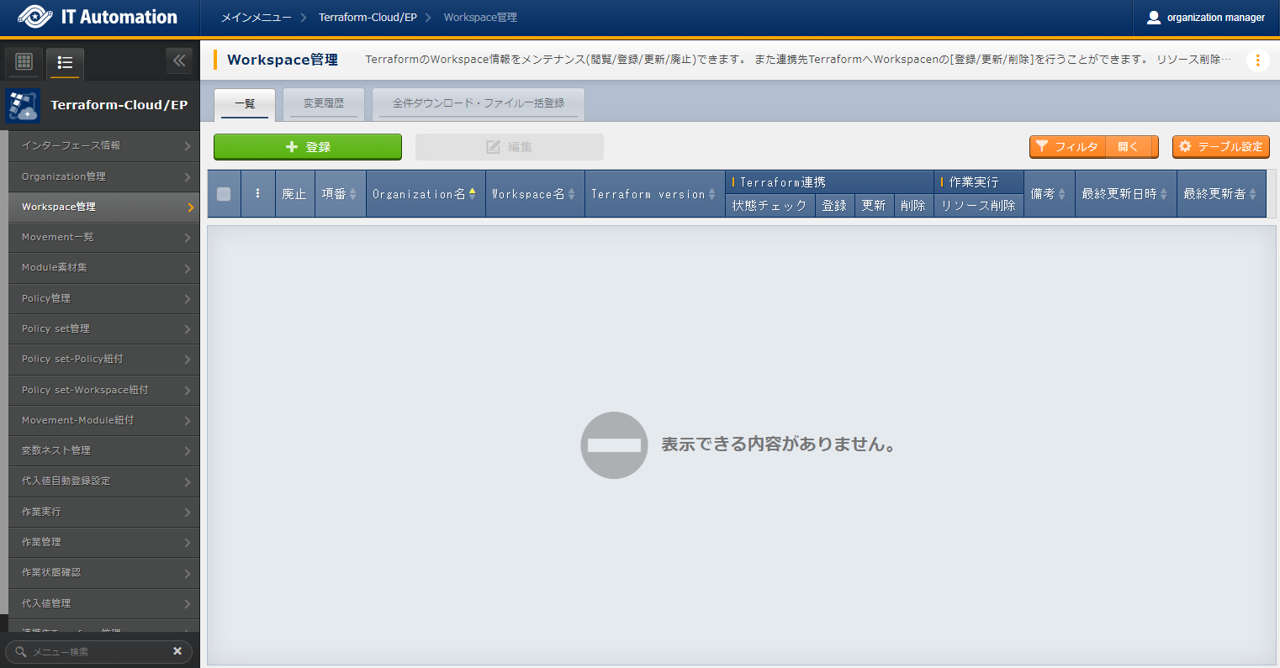 - では「インターフェース情報」に登録した情報をもとにTerraformへ接続し、Terraformに登録されているOrganizaiton/Workspace/Policy/ Policy setの一覧をそれぞれ表示できます。表示された一覧からITAに登録されている対象を、Terraformから削除することができます。Workspaceごとに構成・管理されたリソースの削除を実行することができます。また、Policy setに紐付いたWorkspaceおよびPolicyの紐付けを解除することができます。※このページ上で行う操作について、ITA側の登録対象に影響はありません。