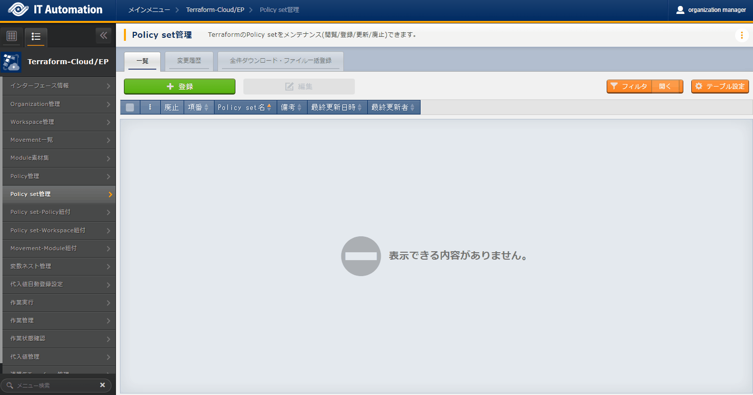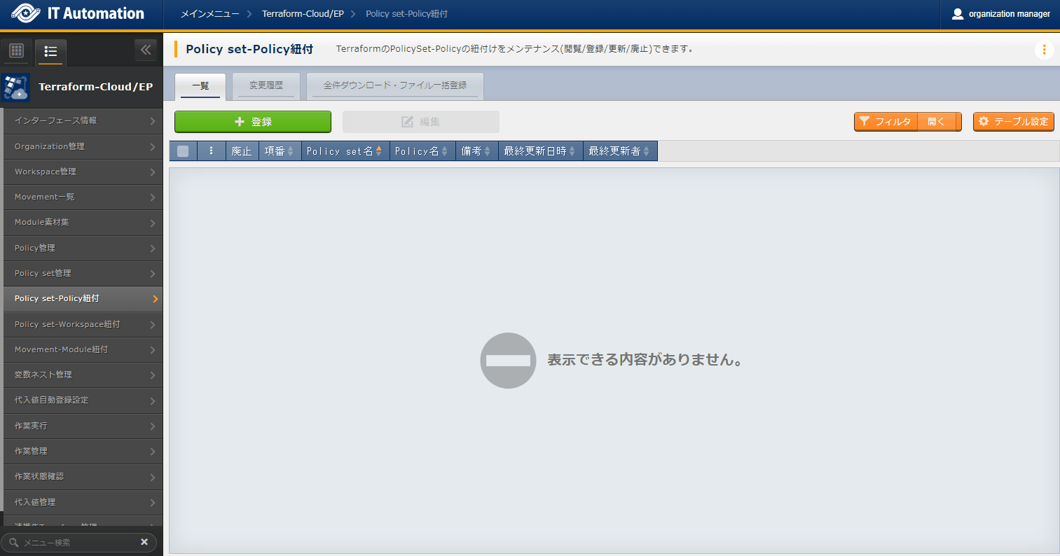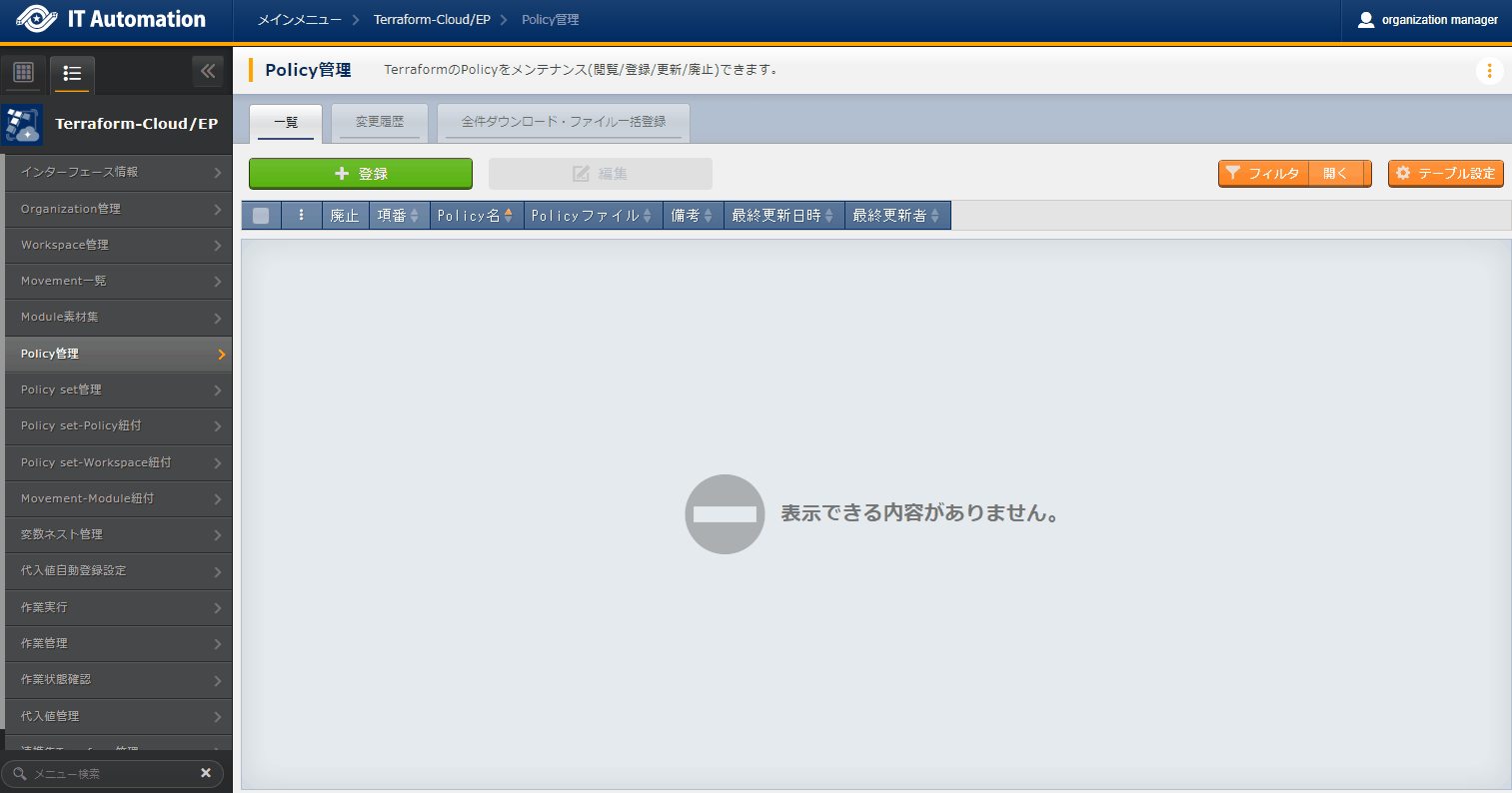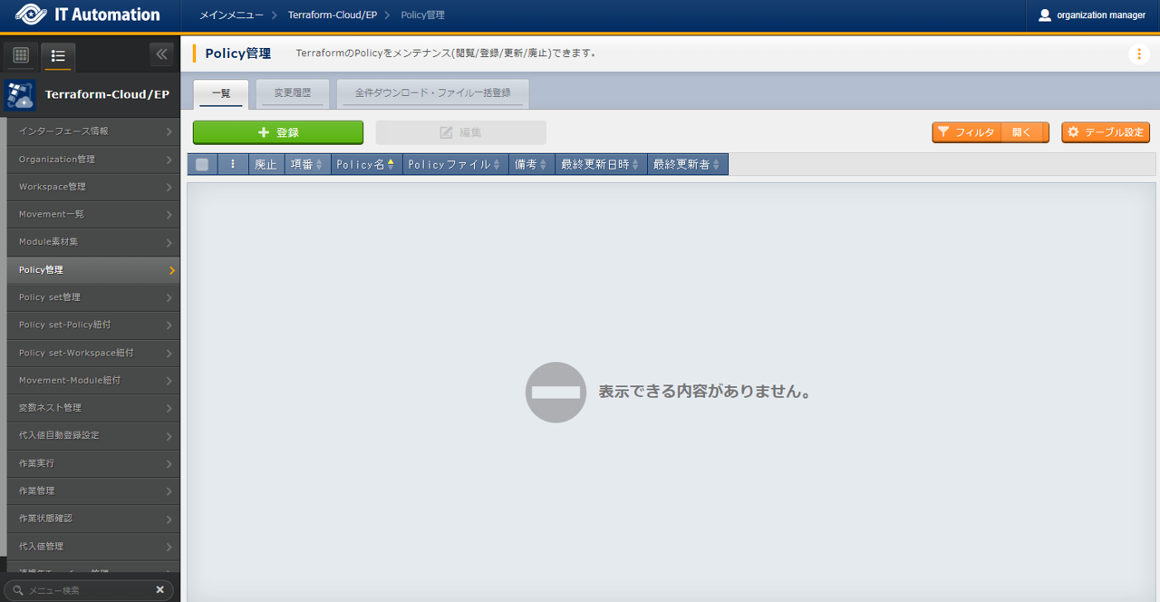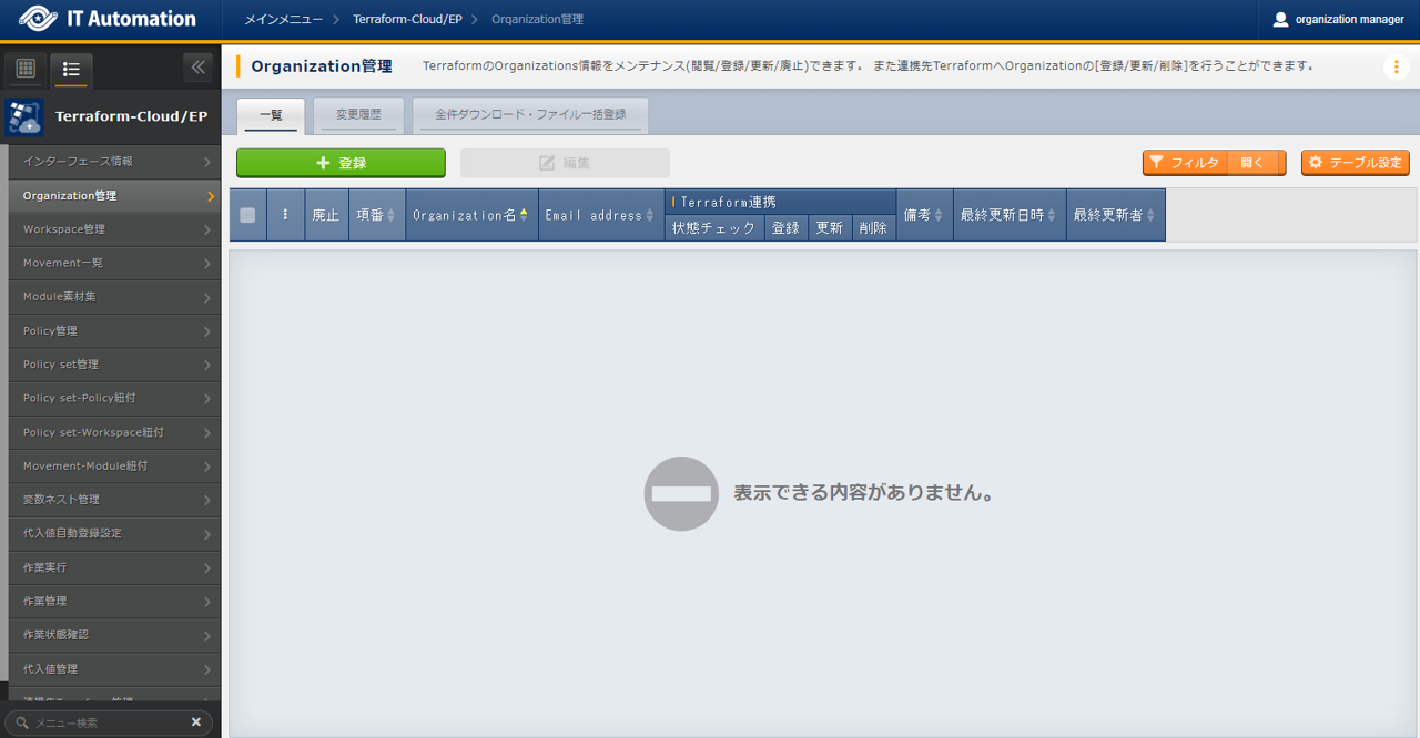 - では「インターフェース情報」に登録した情報をもとにTerraformへ接続し、Terraformに登録されているOrganizaiton/Workspace/Policy/ Policy setの一覧をそれぞれ表示できます。表示された一覧からITAに登録されている対象を、Terraformから削除することができます。Workspaceごとに構成・管理されたリソースの削除を実行することができます。また、Policy setに紐付いたWorkspaceおよびPolicyの紐付けを解除することができます。※このページ上で行う操作について、ITA側の登録対象に影響はありません。
