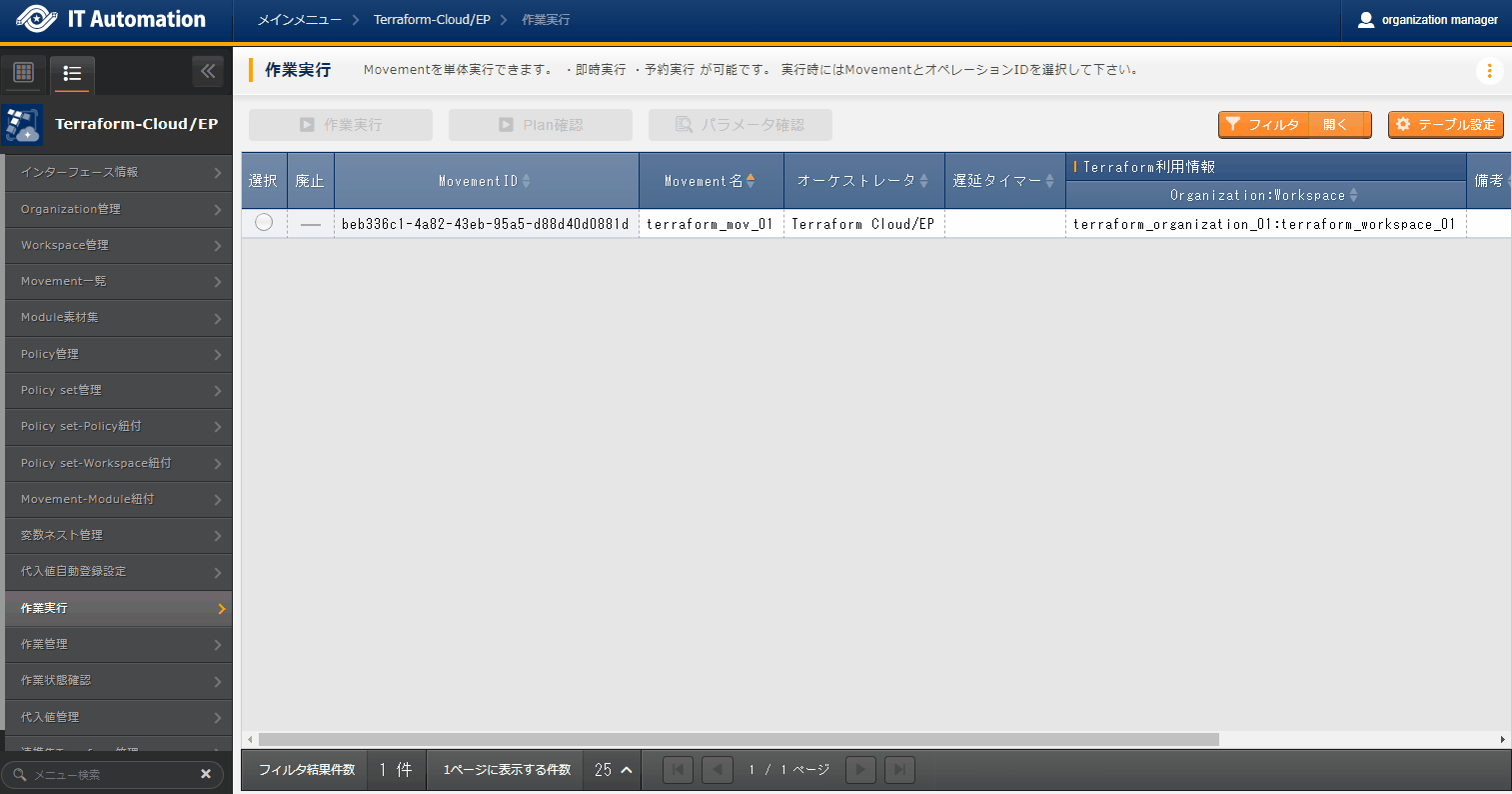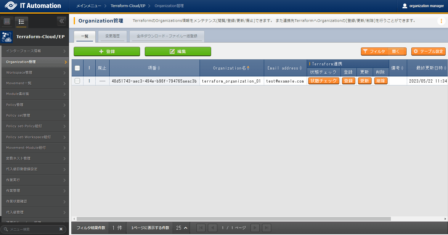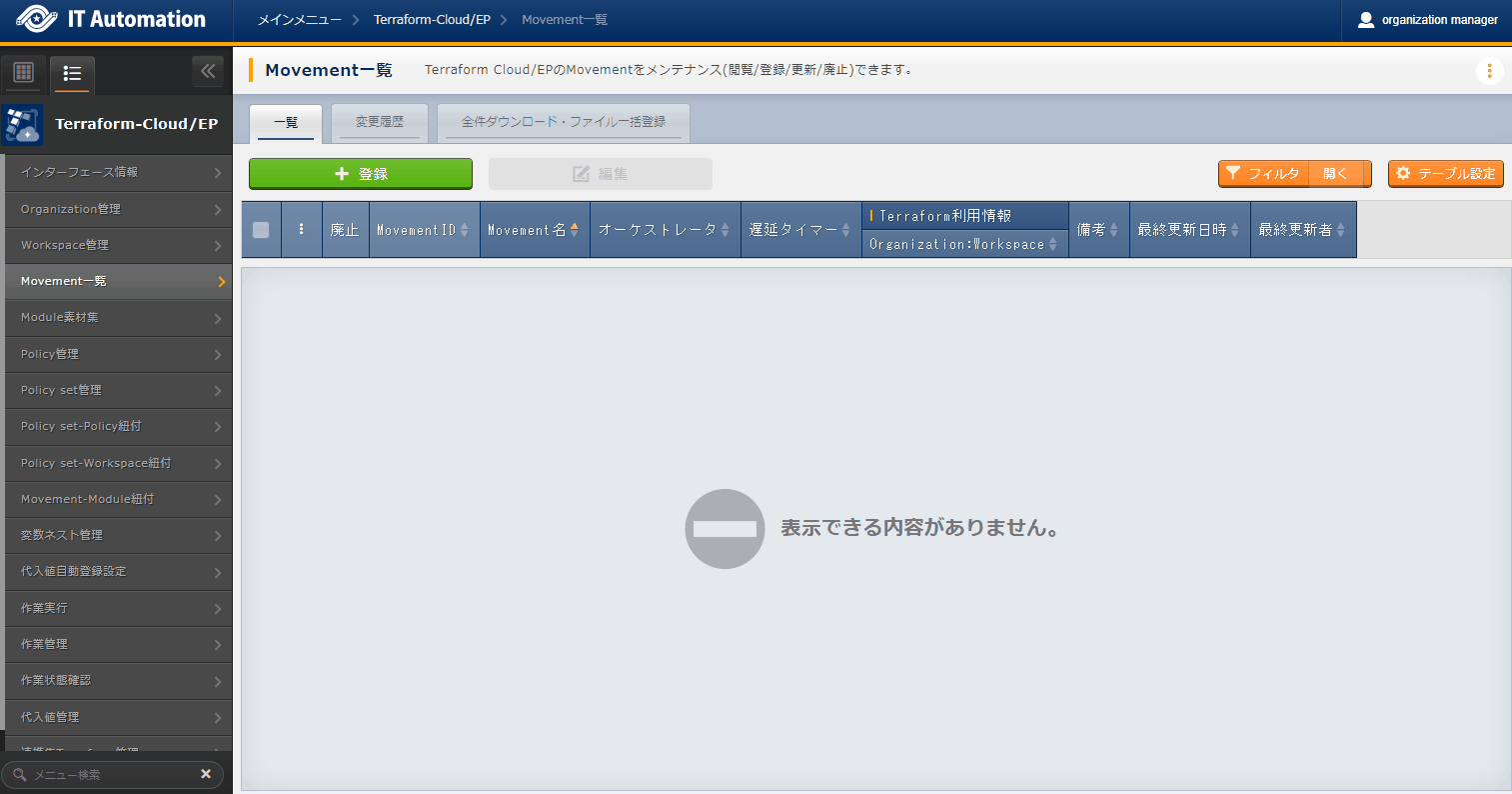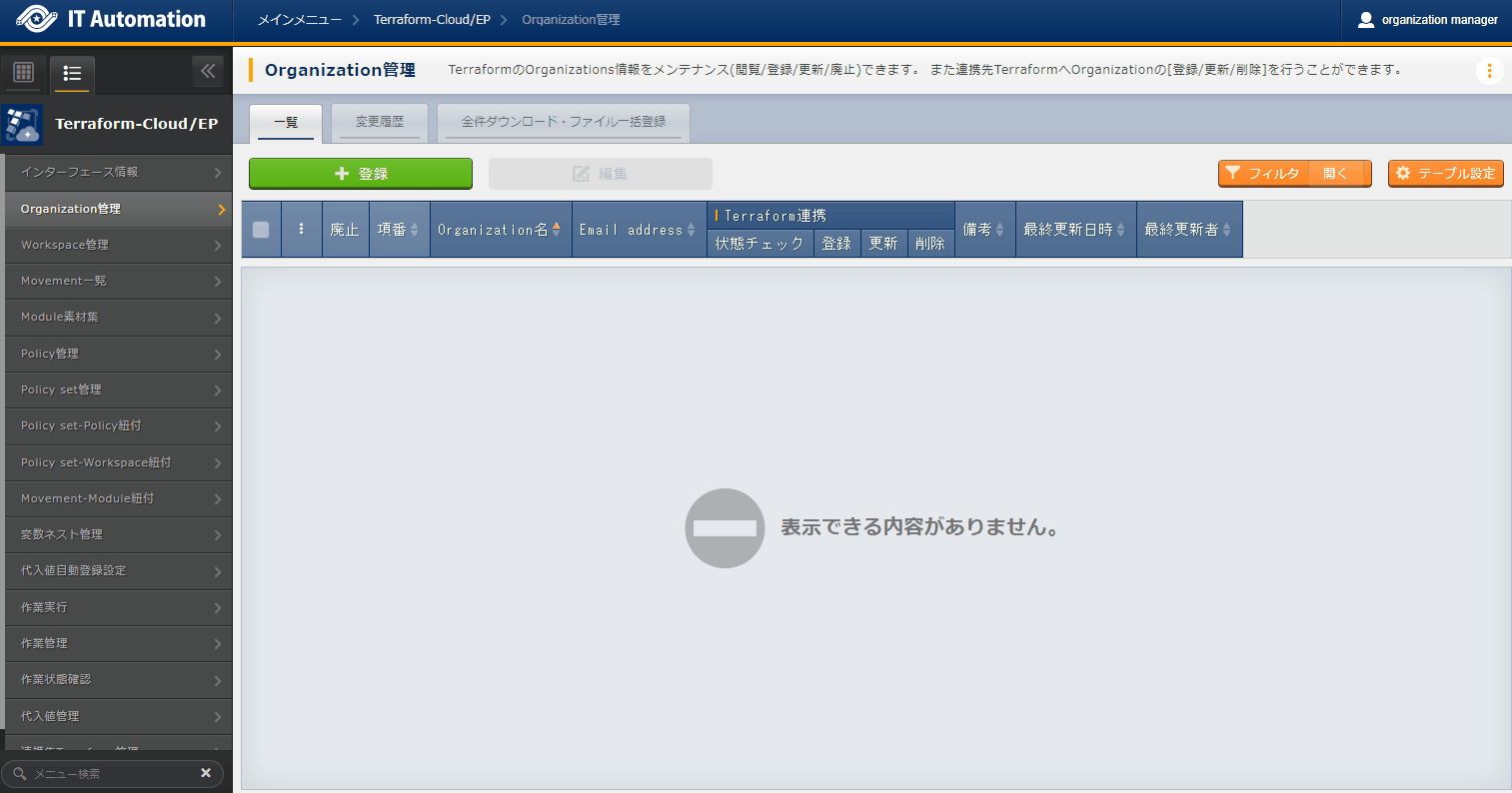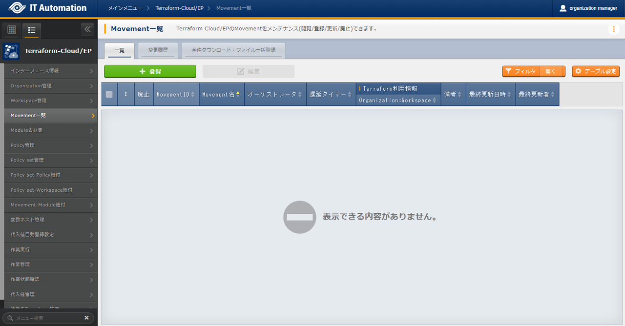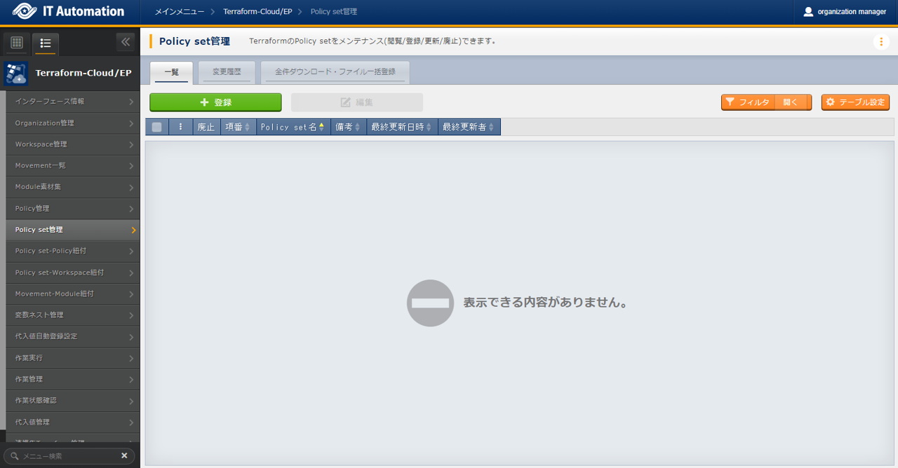 - では「インターフェース情報」に登録した情報をもとにTerraformへ接続し、Terraformに登録されているOrganizaiton/Workspace/Policy/ Policy setの一覧をそれぞれ表示できます。表示された一覧からITAに登録されている対象を、Terraformから削除することができます。Workspaceごとに構成・管理されたリソースの削除を実行することができます。また、Policy setに紐付いたWorkspaceおよびPolicyの紐付けを解除することができます。※このページ上で行う操作について、ITA側の登録対象に影響はありません。