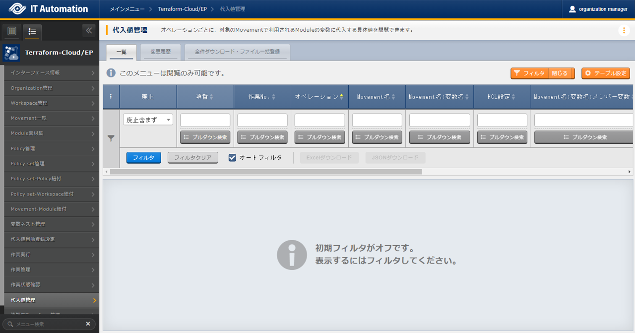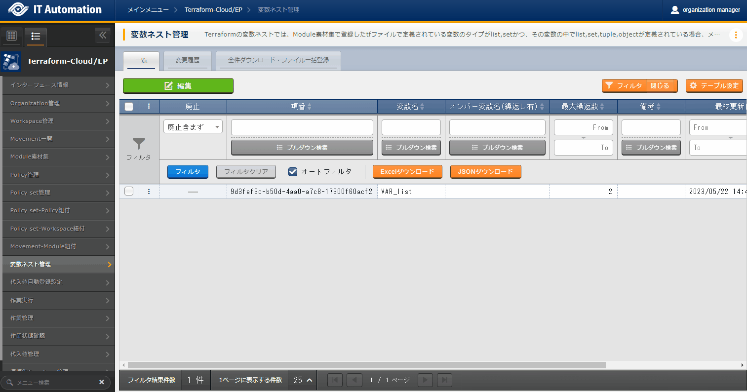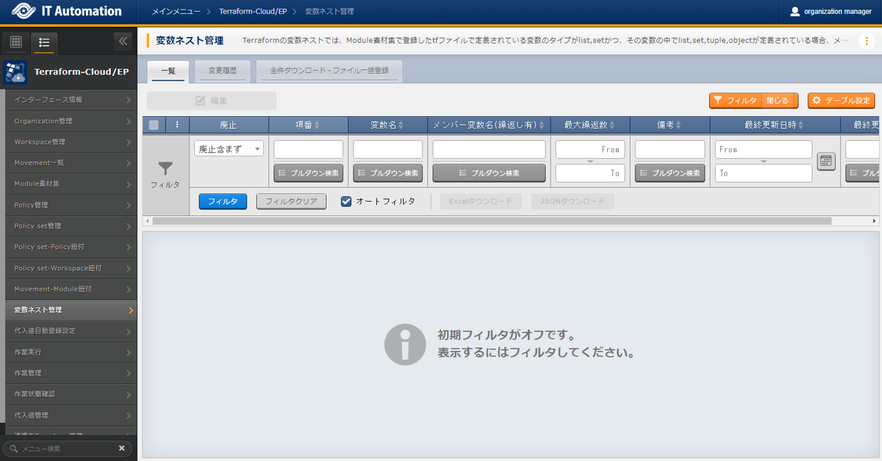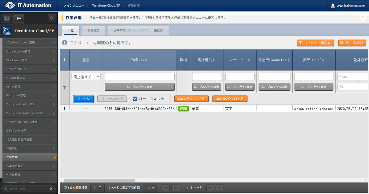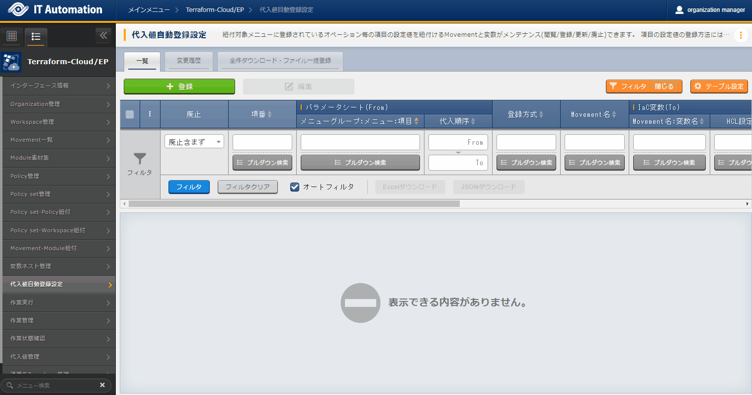 - では「インターフェース情報」に登録した情報をもとにTerraformへ接続し、Terraformに登録されているOrganizaiton/Workspace/Policy/ Policy setの一覧をそれぞれ表示できます。表示された一覧からITAに登録されている対象を、Terraformから削除することができます。Workspaceごとに構成・管理されたリソースの削除を実行することができます。また、Policy setに紐付いたWorkspaceおよびPolicyの紐付けを解除することができます。※このページ上で行う操作について、ITA側の登録対象に影響はありません。
