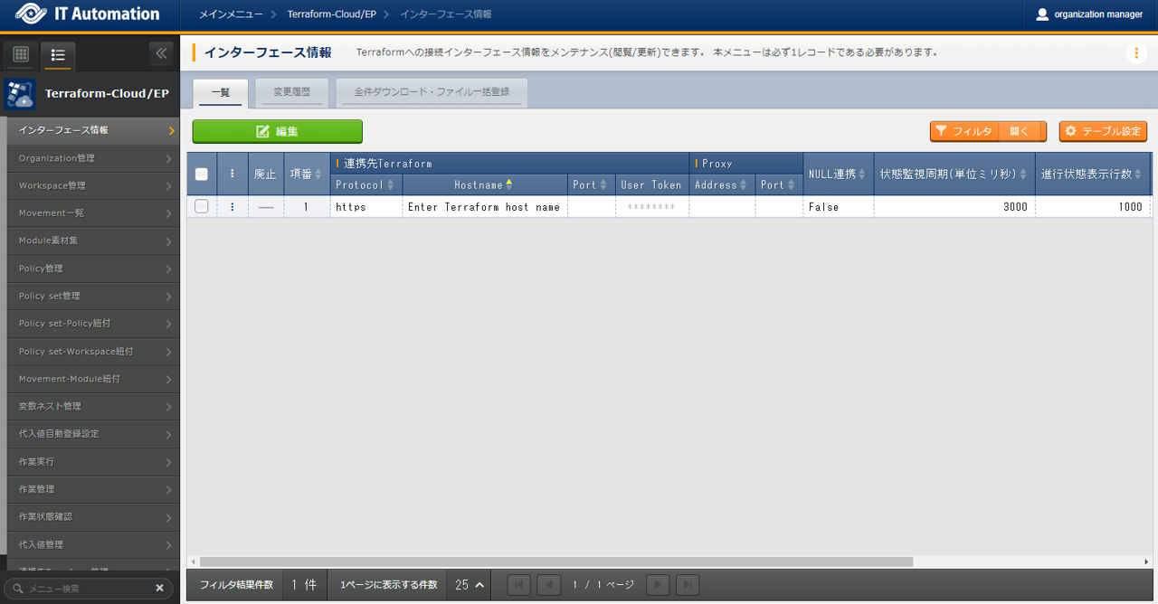 - では、ITAと連携するTerraformの情報をメンテナンス(閲覧/更新)することができます。連携対象となるTerraformのHostnameと、TerraformのUserが発行したUserTokenが必要となります。
