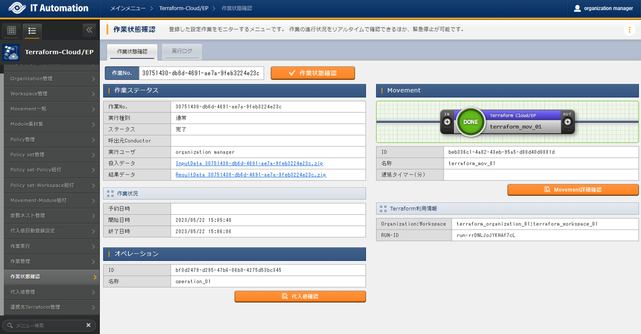 作業実行時に選択したオペレーションが表示されます。