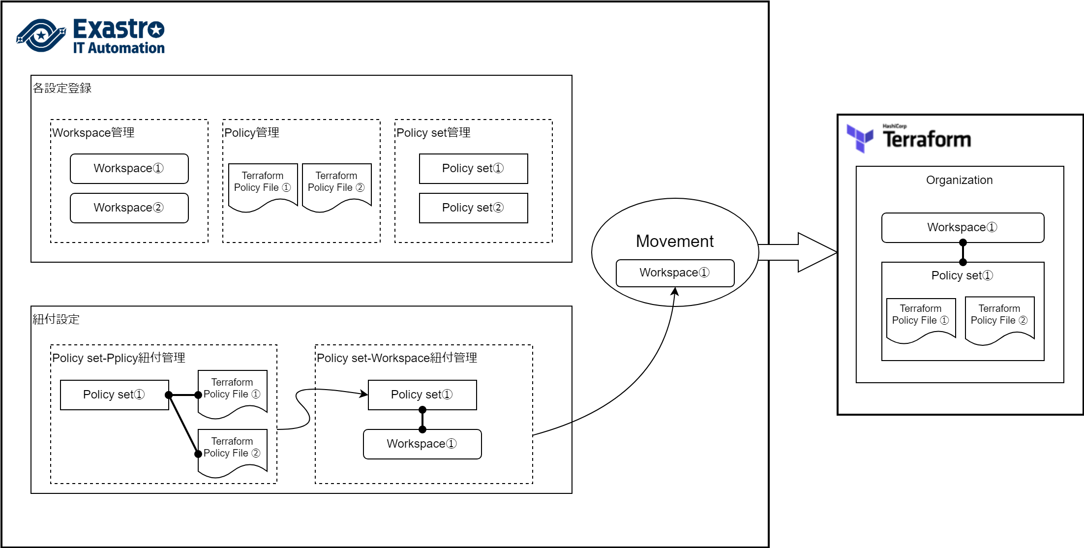 - Policy setにWorkspaceを紐付け(必要に応じて実施)Policy setとWorkspaceの紐付けを登録します。詳細は PolicySet-Workspace紐付 を参照してください。