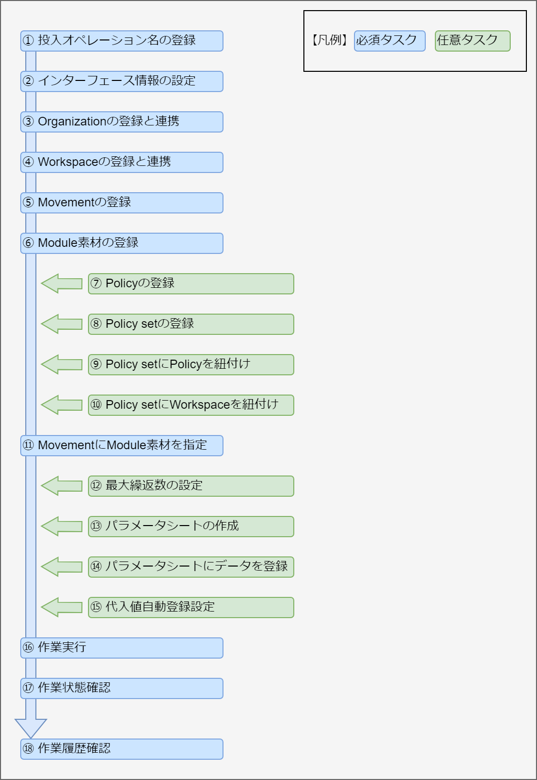 - 代入値自動登録設定(必要に応じて実施)代入値自動登録設定の画面から、パラメータシートに登録されているオペレーション毎の項目の設定値と、Movementの変数を紐付けます。Module素材に定義した変数に具体値を設定する際に必要となります。詳細は 代入値自動登録設定 を参照してください。