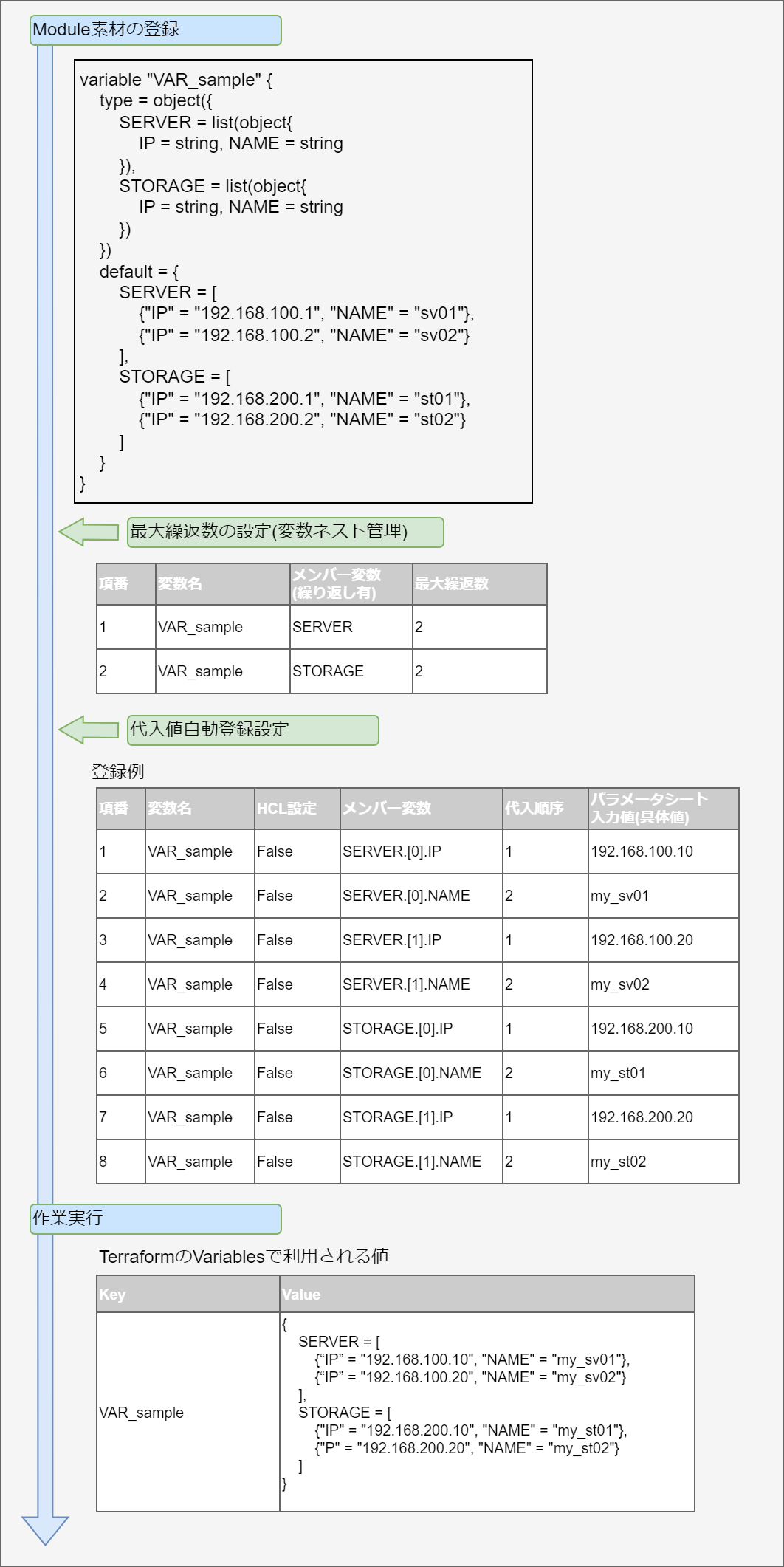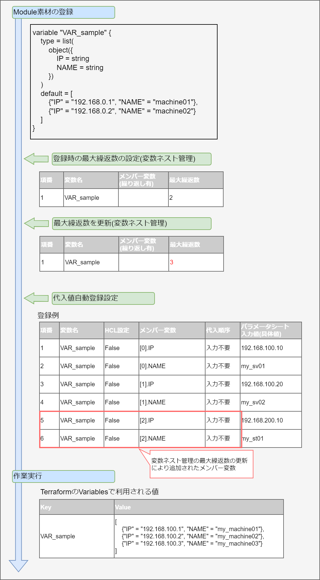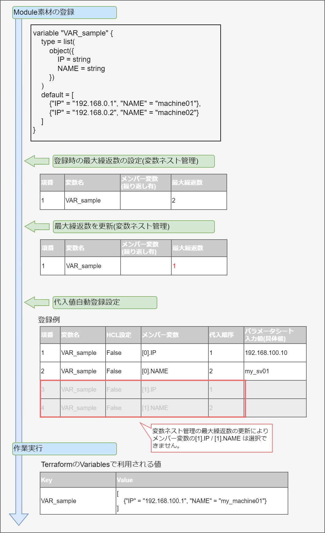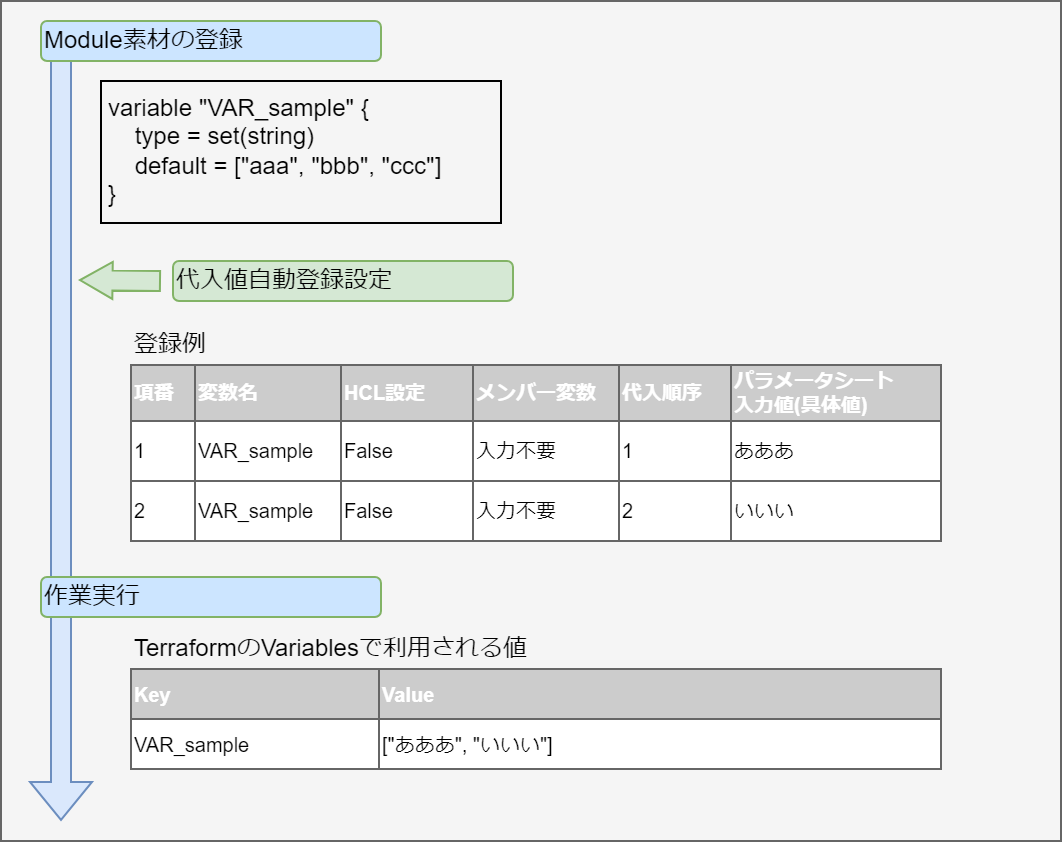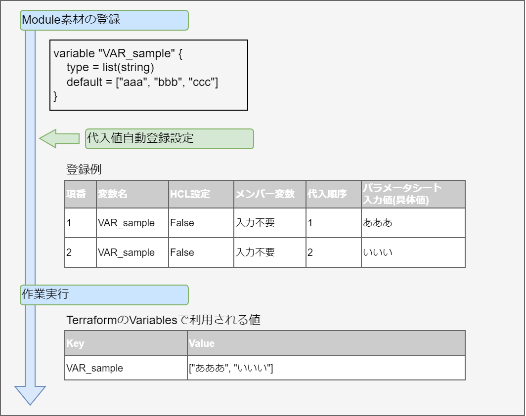 - ※2 …代入順序対象変数に複数具体値を設定する際の先頭から代入する順序です。変数または階層構造の変数の最下層の変数のタイプがlist,setの場合、「Terraform Cloud/EP driver -> 代入値自動登録設定」「Terraform CLI driver -> 代入値自動登録設定」にて設定可能です。
