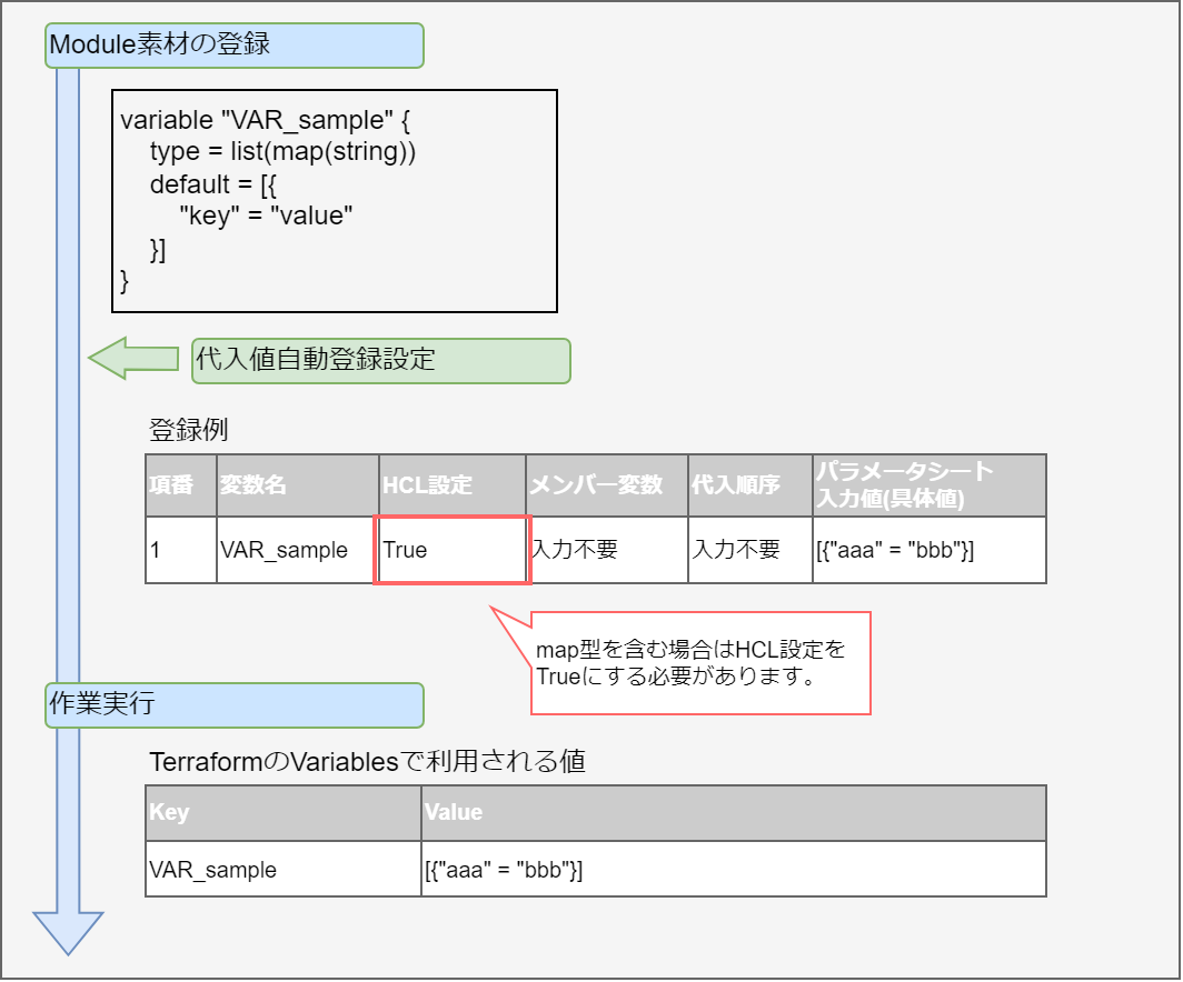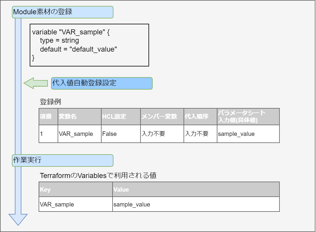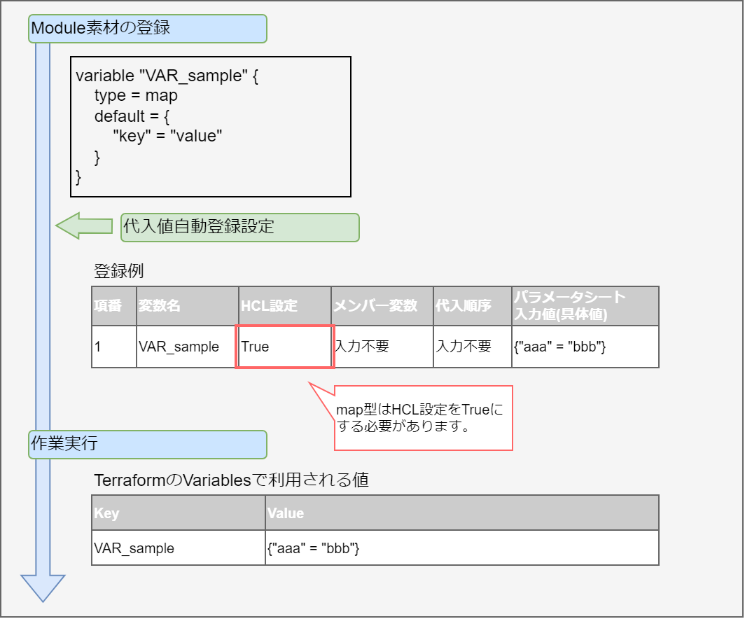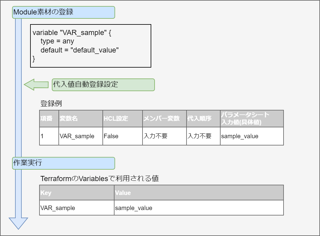変数名に対して具体値を定義できる変数です。 Module内の変数は HCL(HashiCorp Configuration Language)のVariableブロックのルールに従い以下の形式で記述してください。 この場合「xxx」がModuleから変数として抜出されます。 また、typeとdefault値を設定することができます。 この場合、 「○○」がtypeとして、「△△」がdefaultとして抜出されます。 typeとdefaultの設定は必須ではありません。