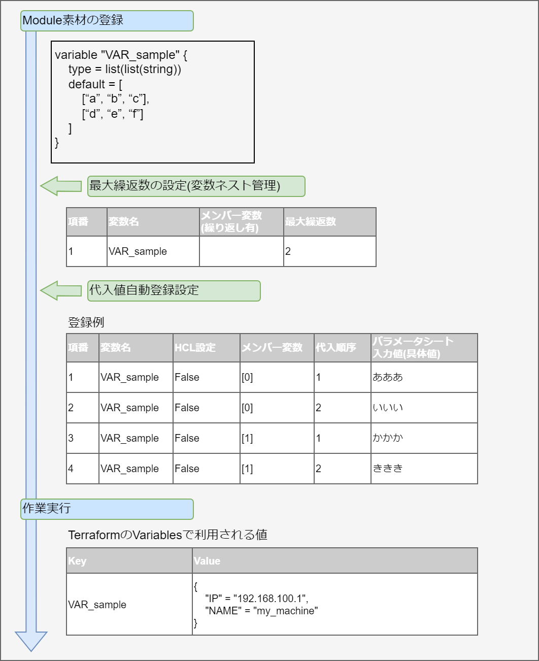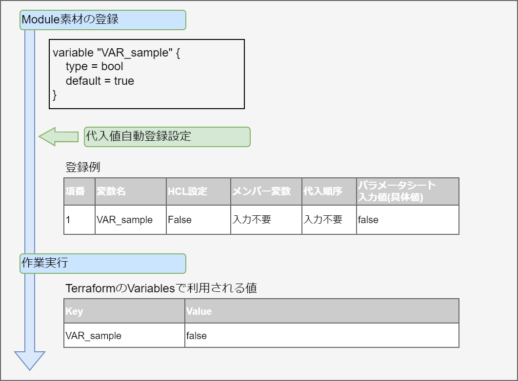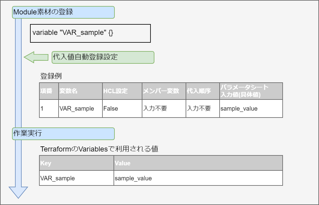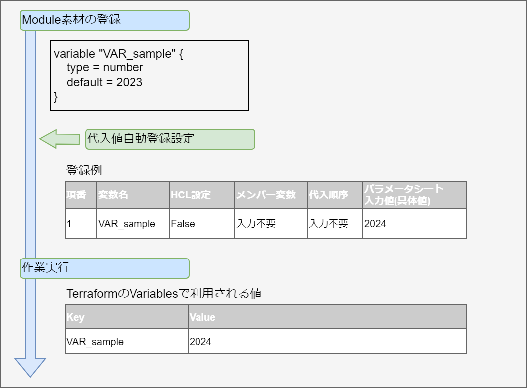 変数名に対して具体値を定義できる変数です。 Module内の変数は HCL(HashiCorp Configuration Language)のVariableブロックのルールに従い以下の形式で記述してください。 この場合「xxx」がModuleから変数として抜出されます。 また、typeとdefault値を設定することができます。 この場合、 「○○」がtypeとして、「△△」がdefaultとして抜出されます。 typeとdefaultの設定は必須ではありません。