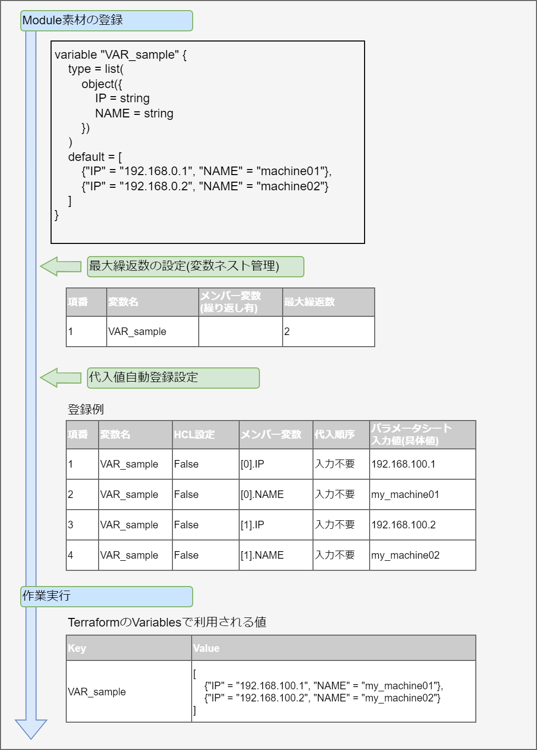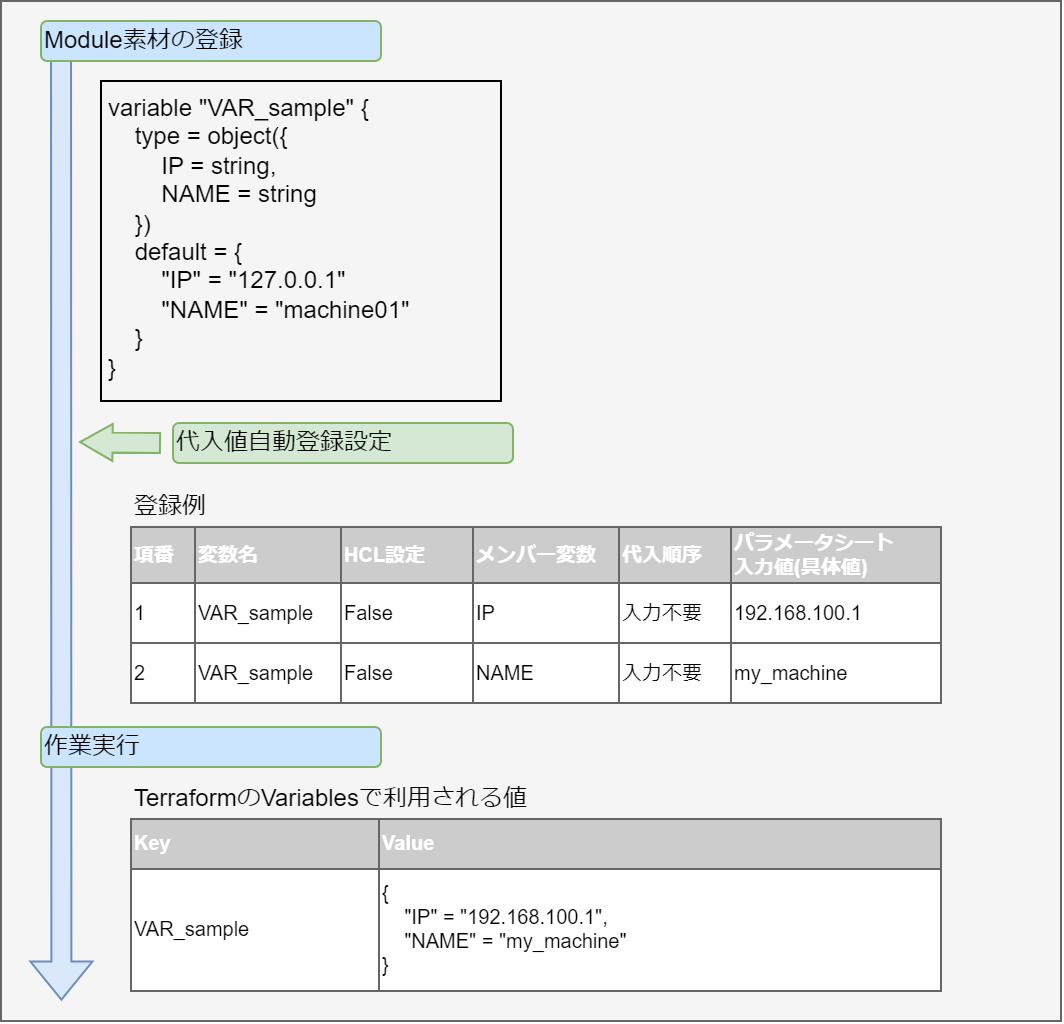 variable "VAR_hoge" { type = object({ NAME = string, IP = string }) default = { "NAME" = "machine_01", "IP" = "127.0.0.1" } }