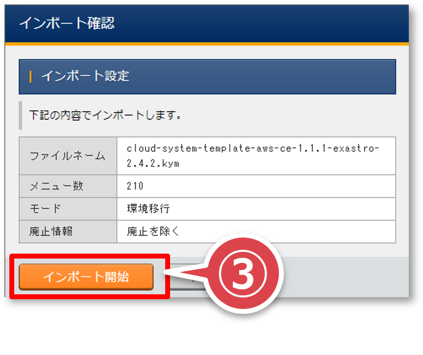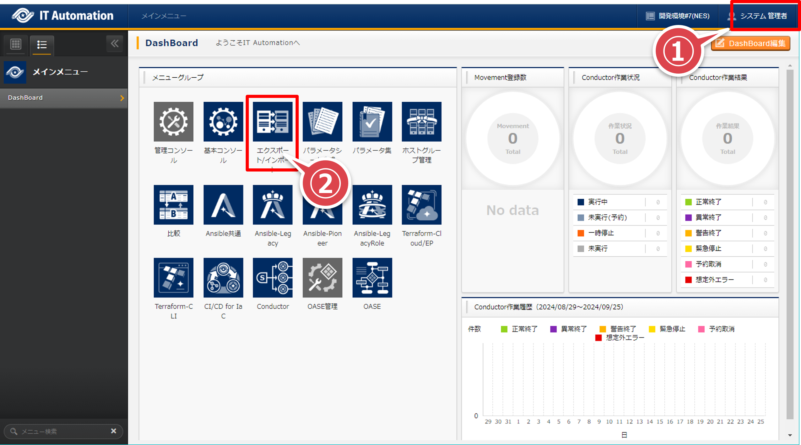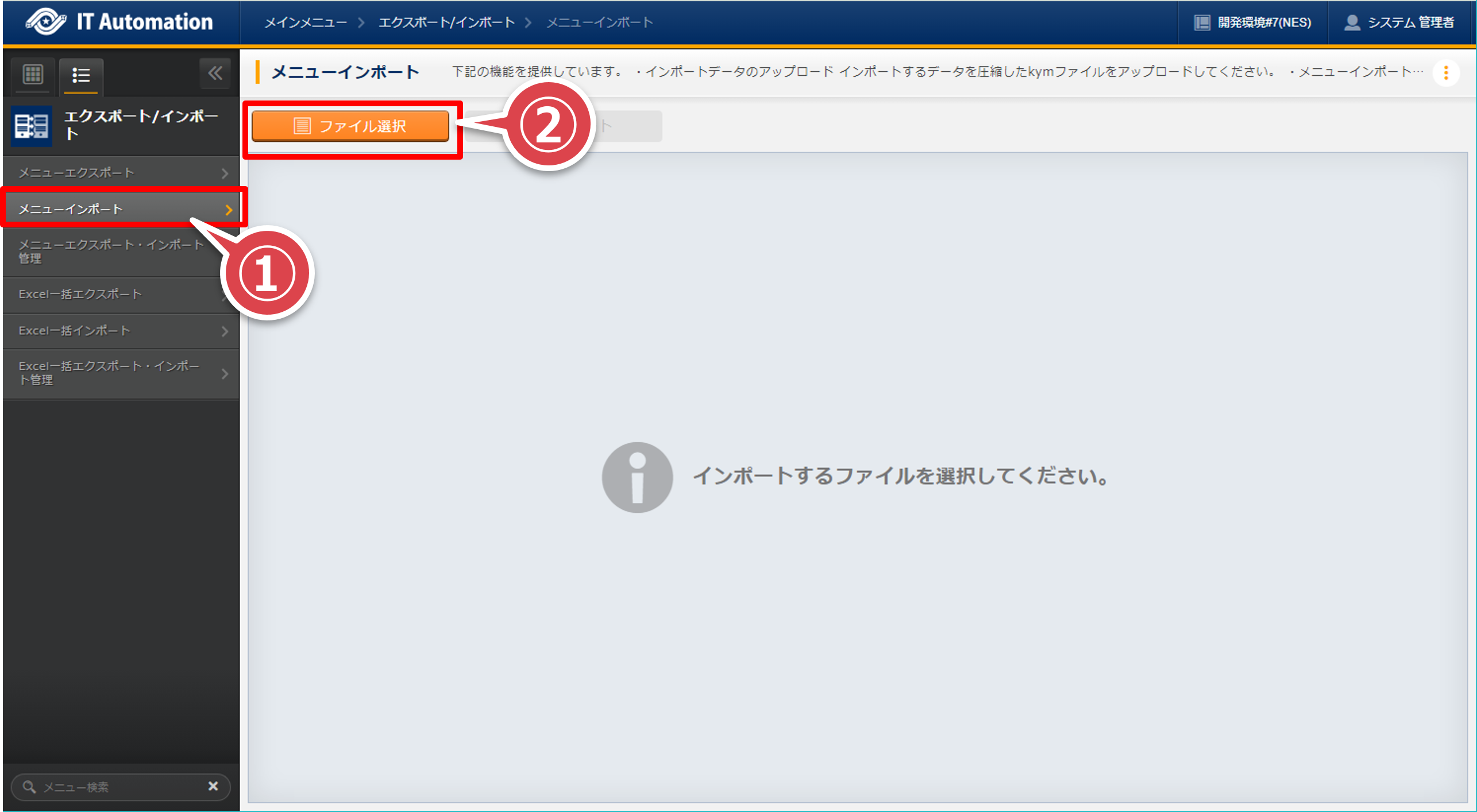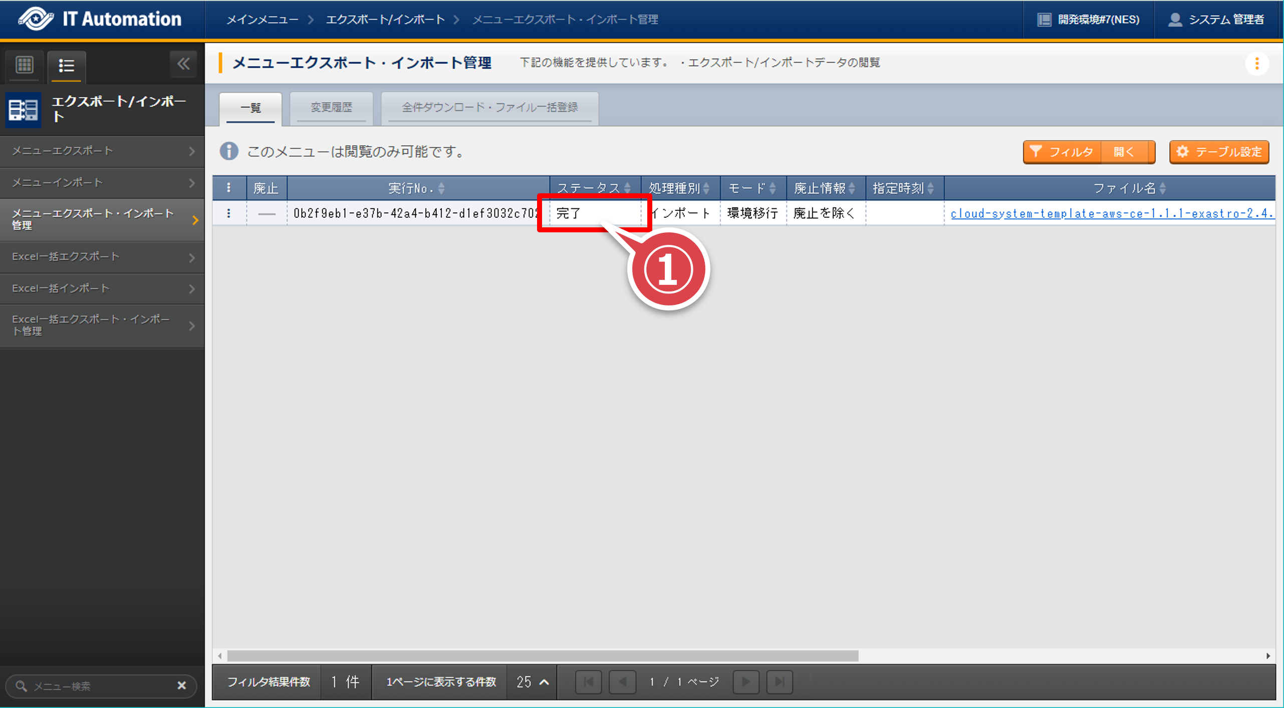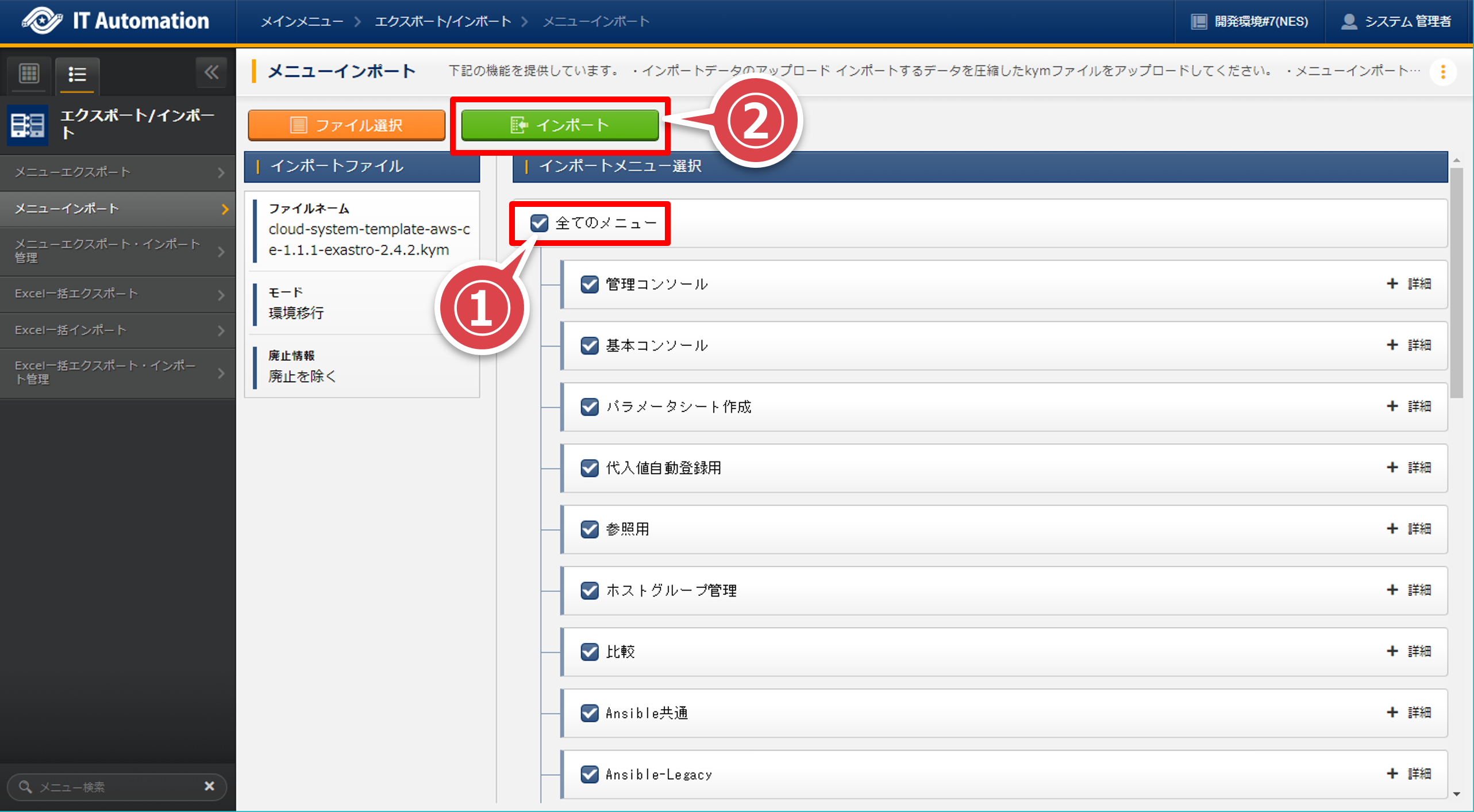 3. 1stモデル導入ファイルインポート¶ 3.1. 1stモデルのインポート¶ ITAに「システム管理者」でログインする。 Tip 実行者:システム管理者 ユーザー名:admin パスワード:P@ssw0rd メインメニューの「エクスポート/インポート」アイコンを押下する。 ファイル選択のダイアログで1stモデル導入ファイルを選択して「開く」ボタンを押下する 「すべてのメニュー」にチェックが入っていることを確認して「インポート」ボタンを押下する 「インポート確認」ポップアップ画面の「インポート開始」ボタンを押下する 「メニューエクスポート・インポート管理」画面に遷移するので「ステータス」が”完了”になることを確認します。 「ステータス」が変化しない場合はブラウザをリロードします。 3.2. メインメニューの確認¶ インポートが完了した後、ITAに「1stモデル管理者」でログインする。 初回ログイン時にパスワード変更画面に遷移した場合はパスワードを変更する Tip 実行者:1stモデル管理者 ユーザー名:ita-1st-admin パスワード:password ユーザー「1stモデル管理者」で表示されるメインメニューは以下のとおり 前のトピックへ2. 1stモデル導入ファイルダウンロード 次のトピックへ4. 機器一覧のログイン情報の変更 ↑ Page Top