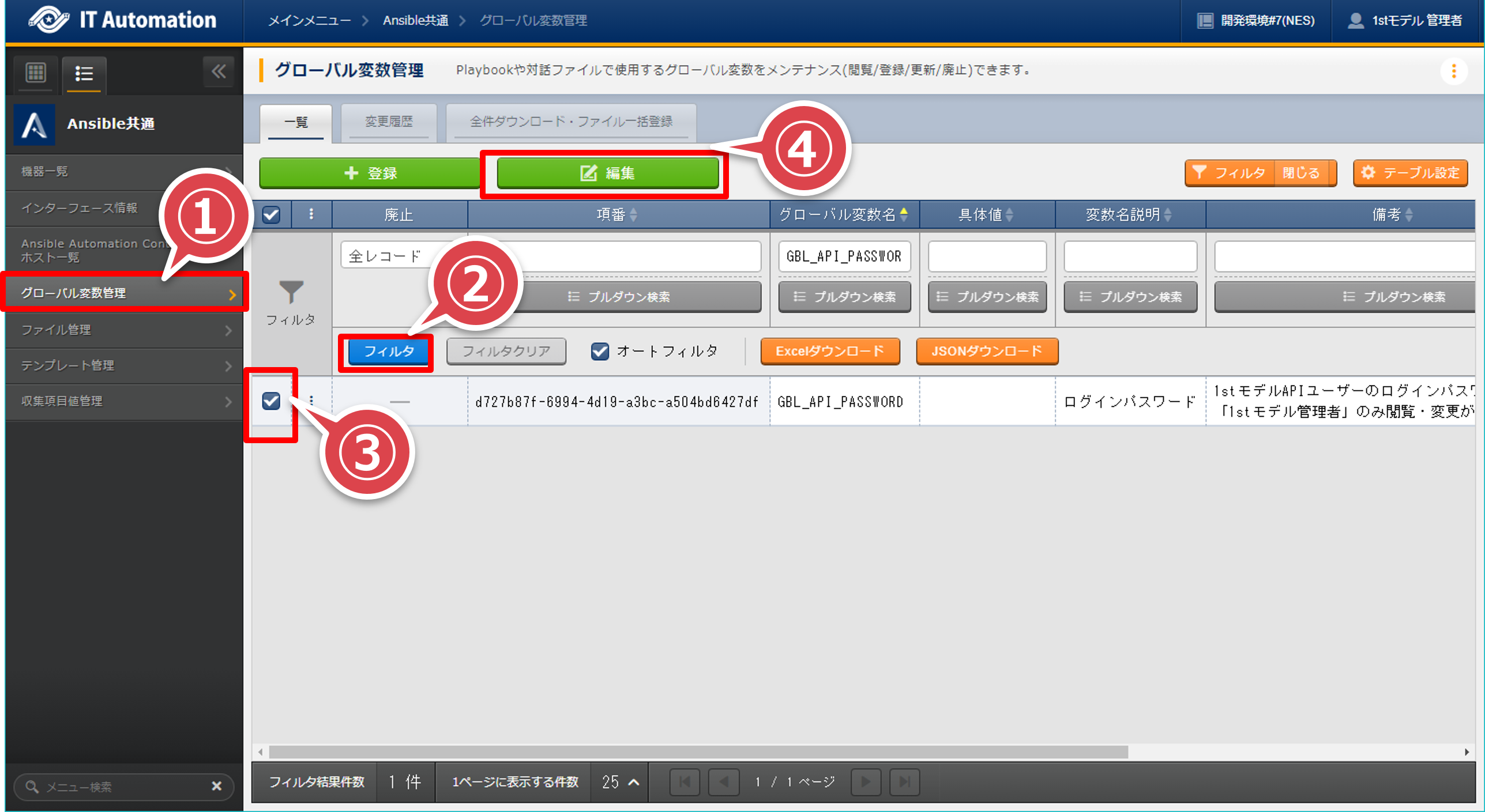 「グローバル変数管理」へ移動して「フィルタ」ボタンを押下する。