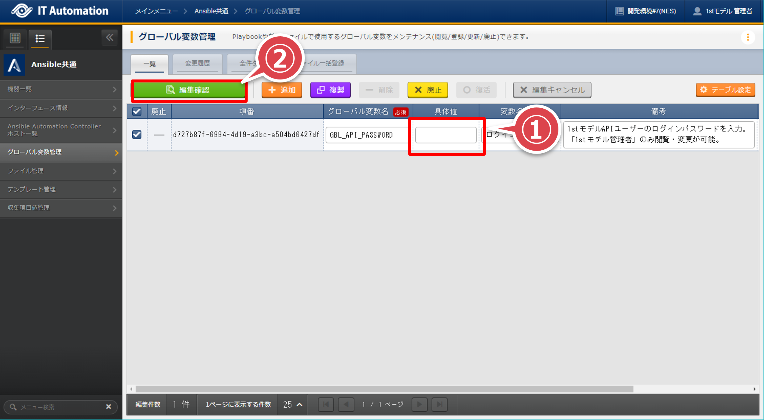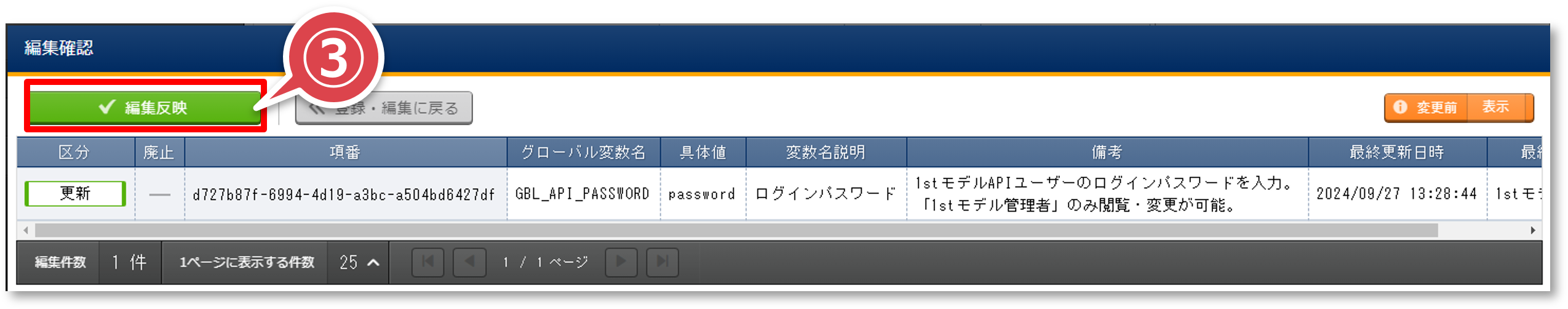 - 「グローバル変数名」が”GBL_API_PASSWORD”のレコードをチェックして「編集」ボタンを押下する。フィルタの「グローバル変数名」で検索すると間違いがない