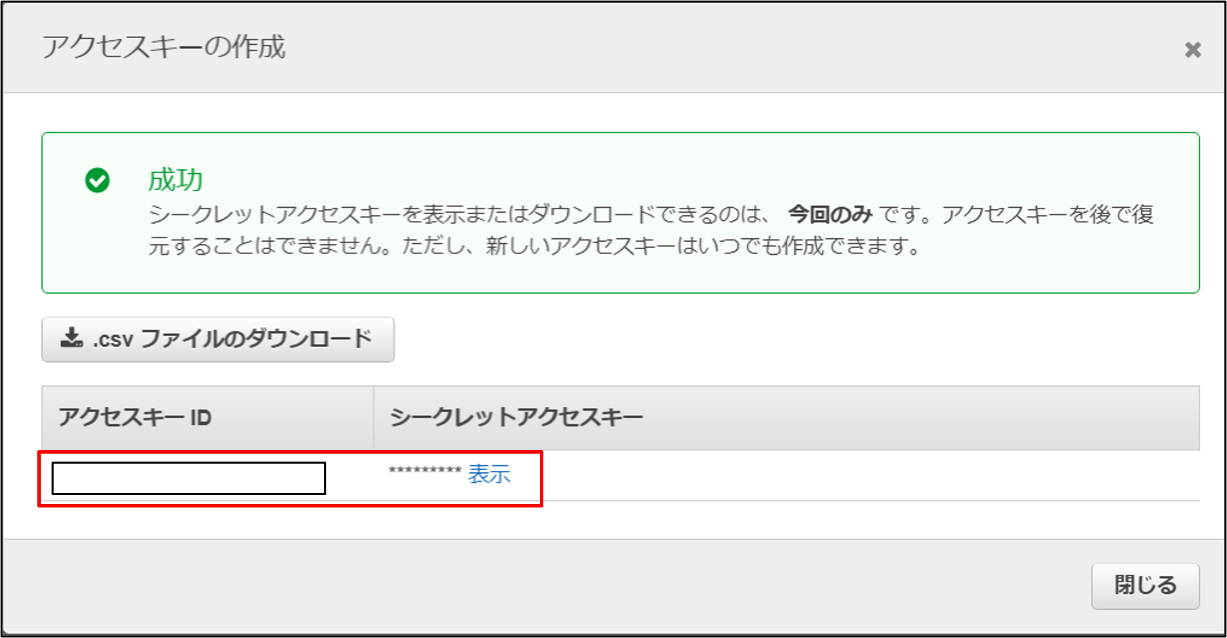 上記IAMユーザーの「アクセスキーID」「シークレットキー」を作成して保管しておく (後ほどITAに登録)