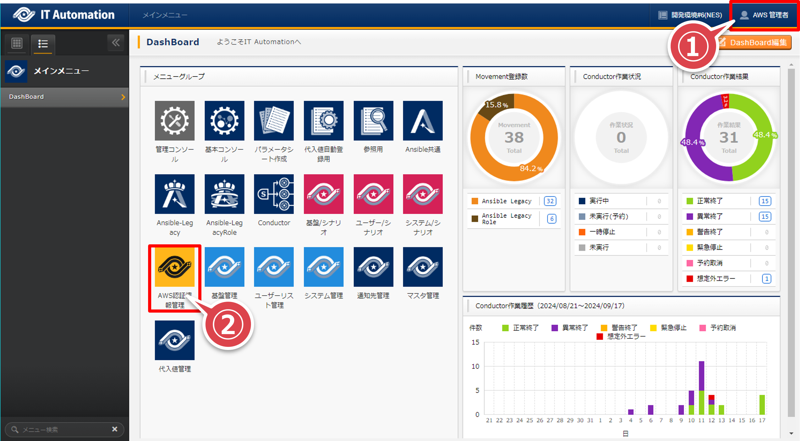 実行者:AWS管理者ユーザー名:aws-adminパスワード:passwordメインメニューの「AWS認証情報管理」アイコンを押下する