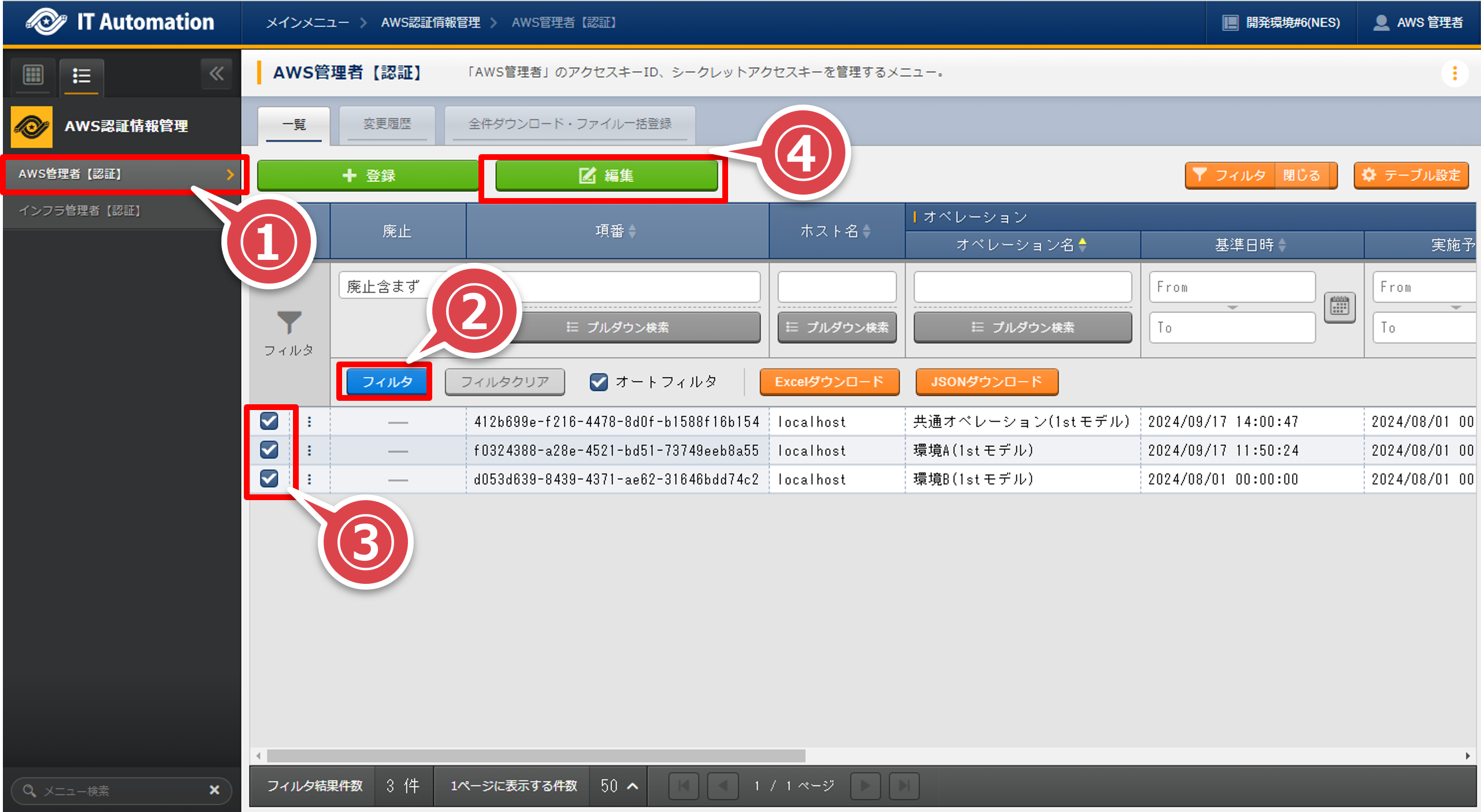 「AWS管理者【認証】」へ移動して「フィルタ」ボタンを押下する