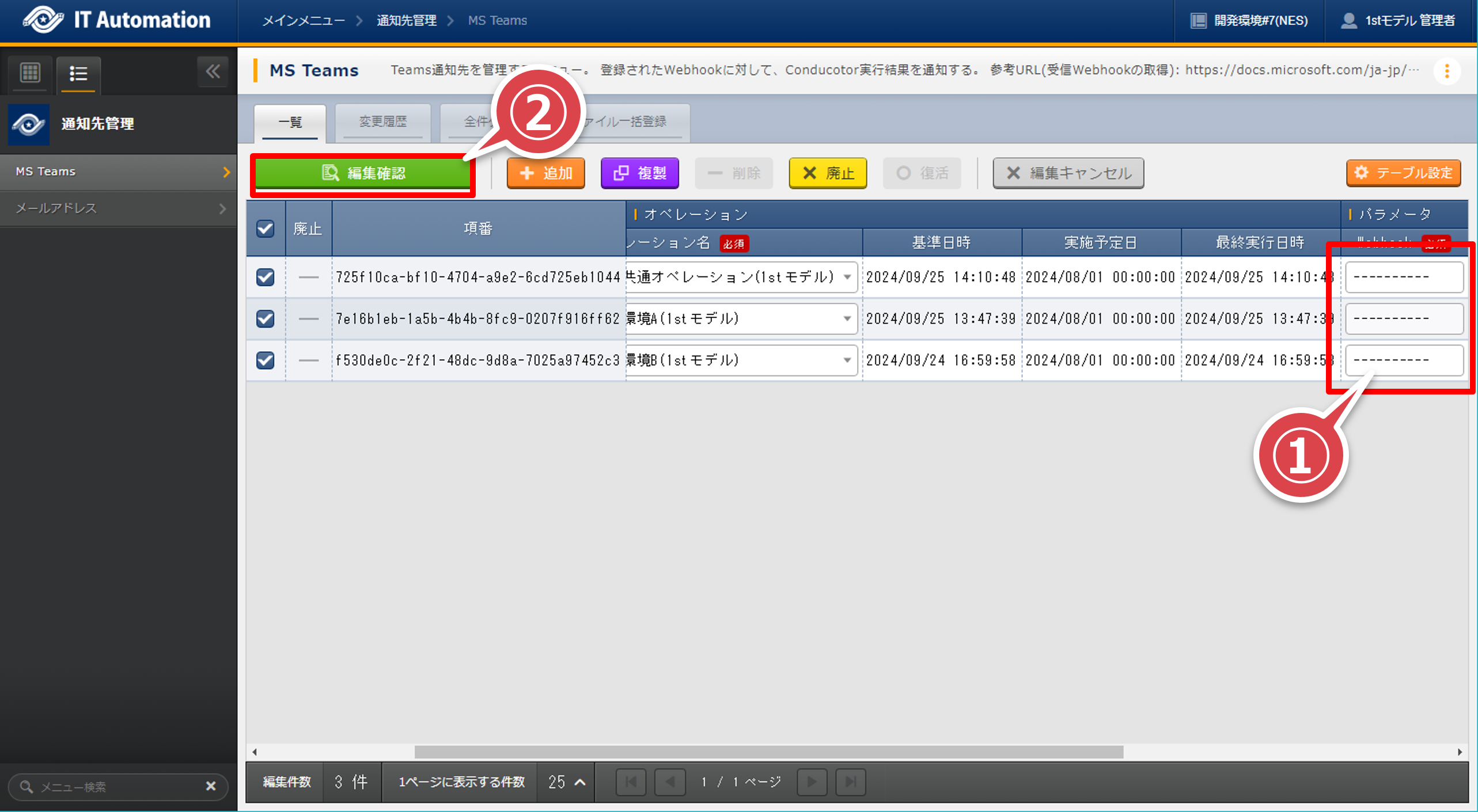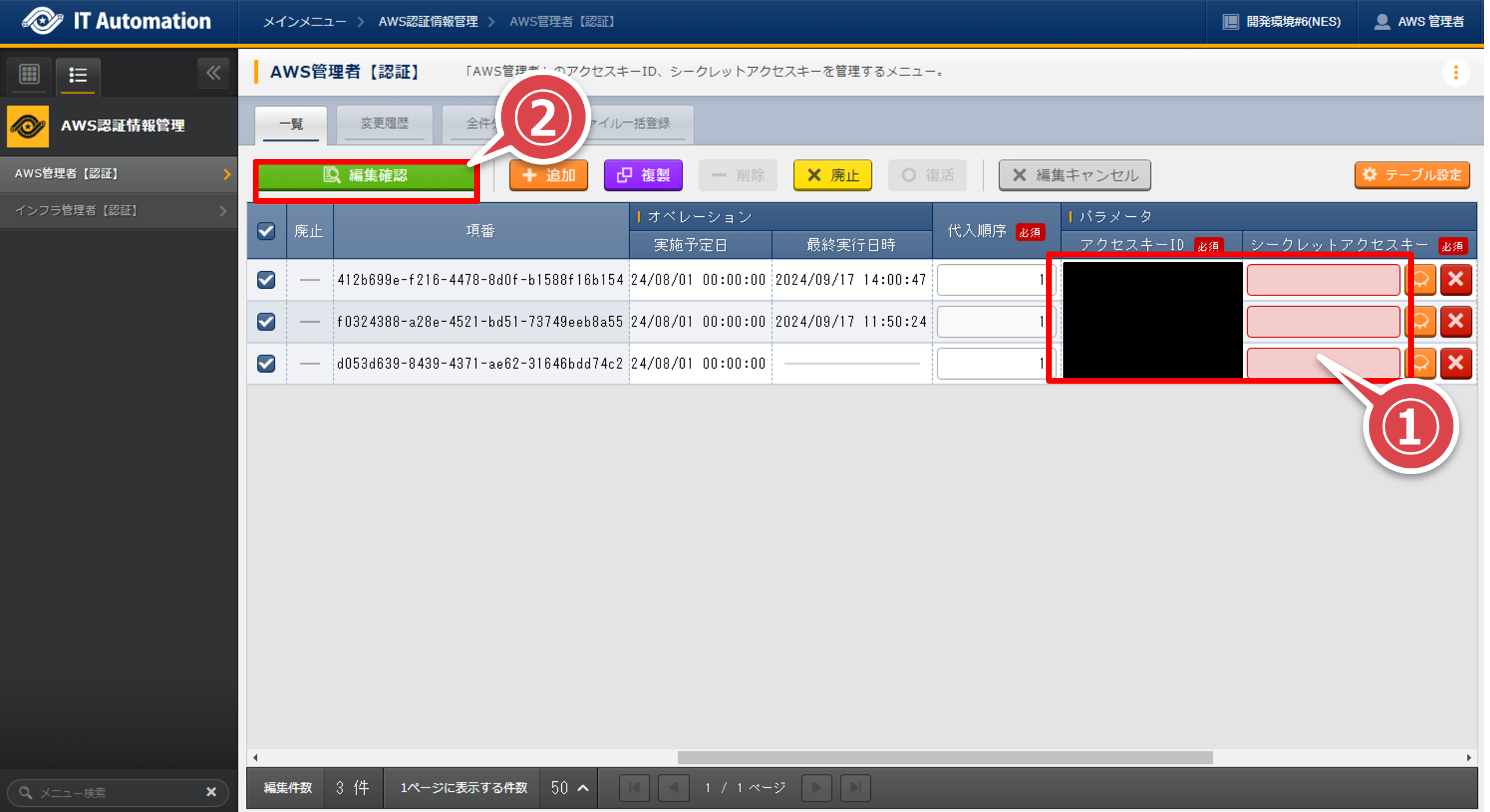 全てのレコードの「アクセスキーID」「シークレットアクセスキー」に「AWSリソースの確認(Conductor実行後)」の(※1)でメモしたアクセスキー、シークレットアクセスキーを入力して「編集確認」ボタンを押下する。