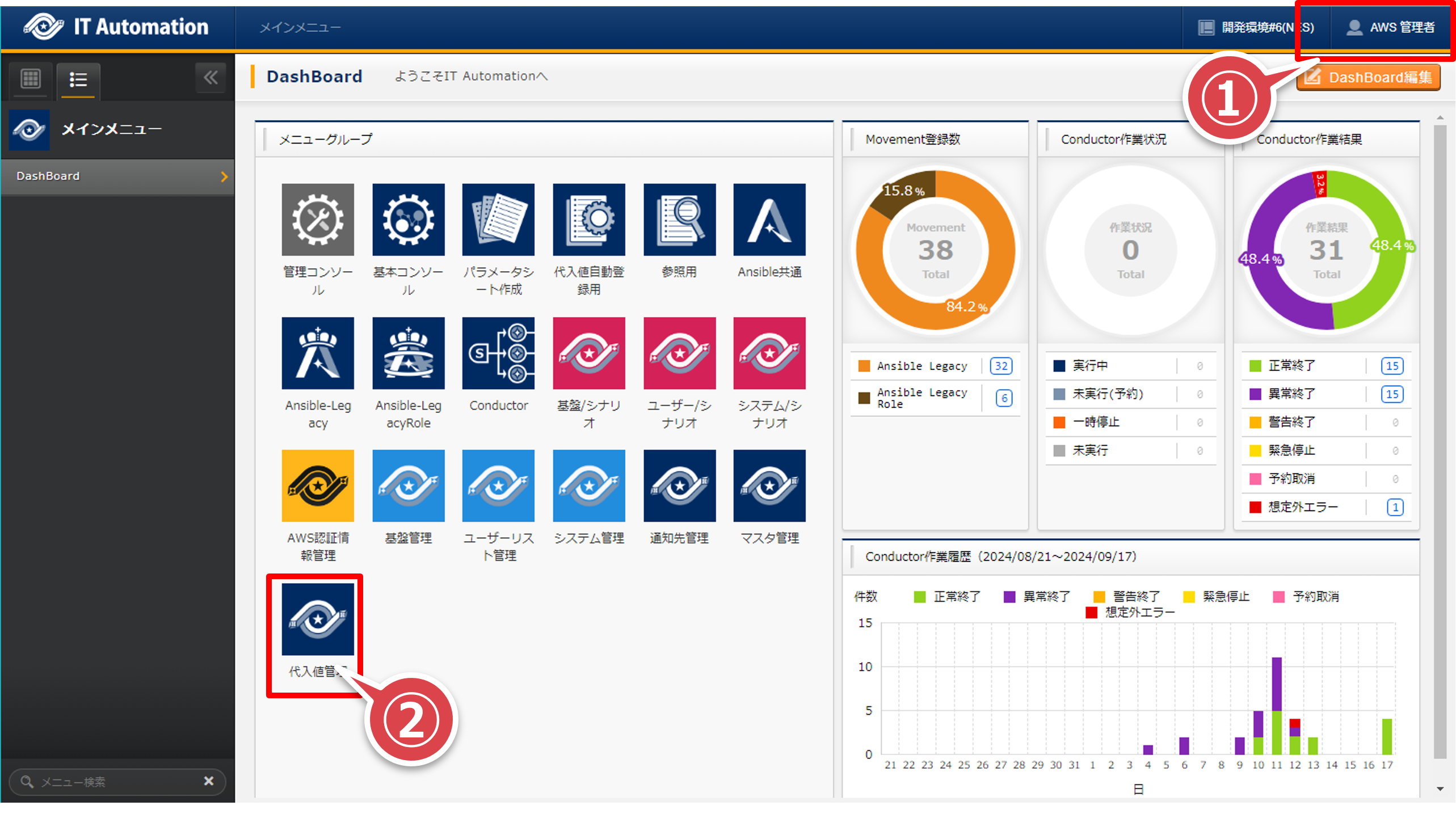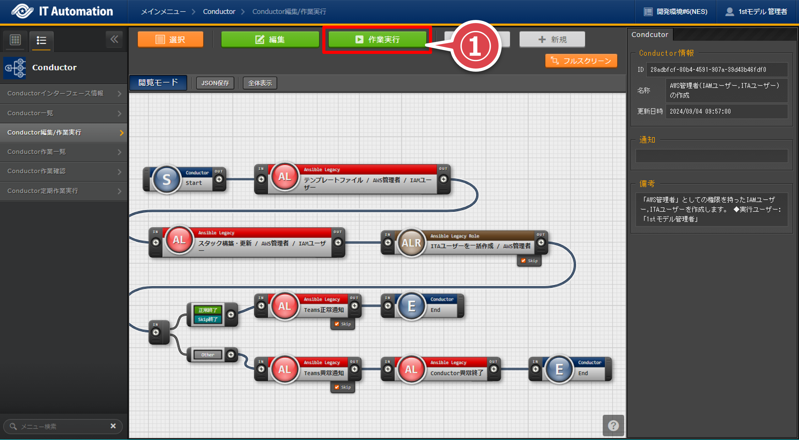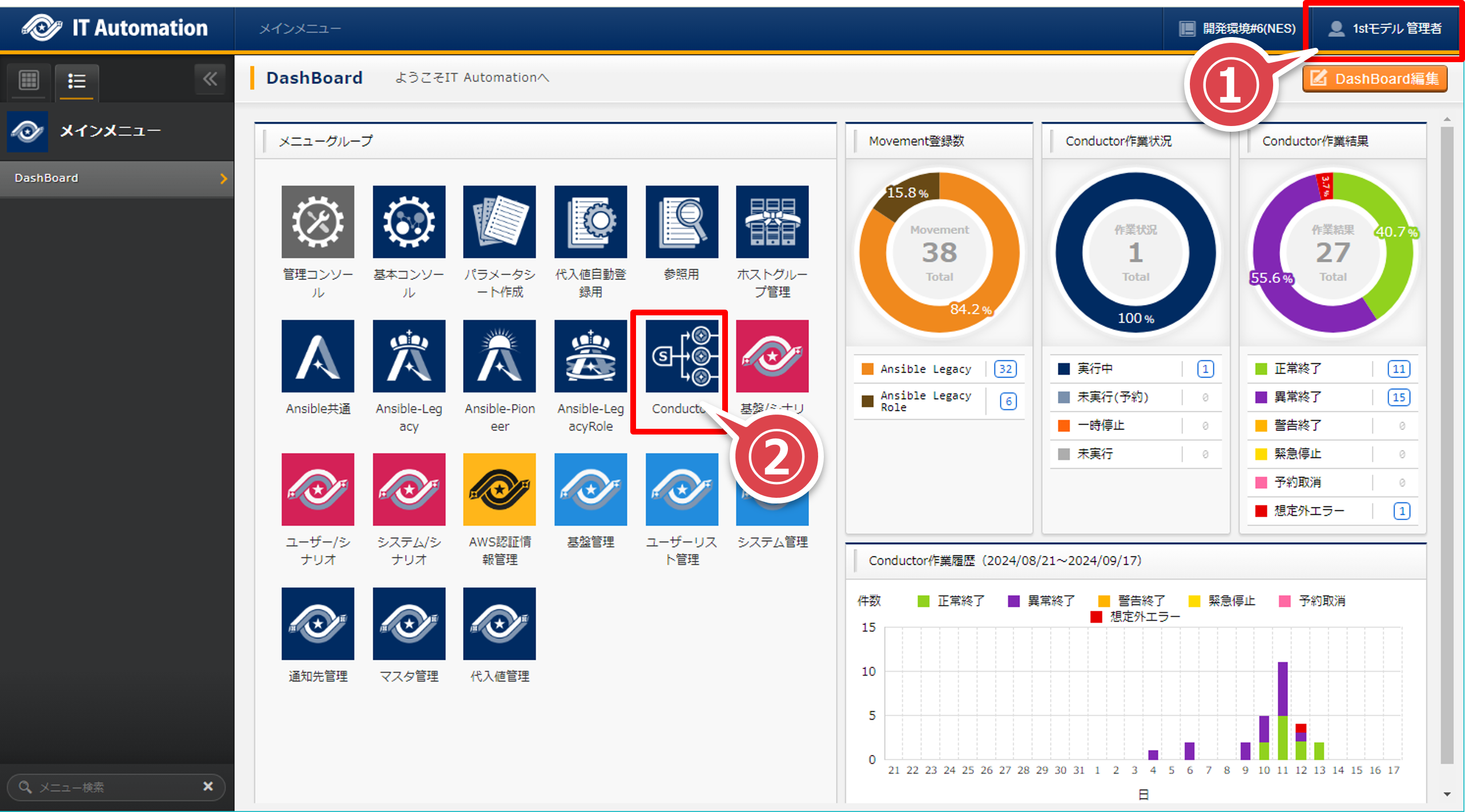 実行者:1stモデル管理者ユーザー名:ita-1st-adminパスワード:passwordメインメニューの「Conductor」アイコンを押下する