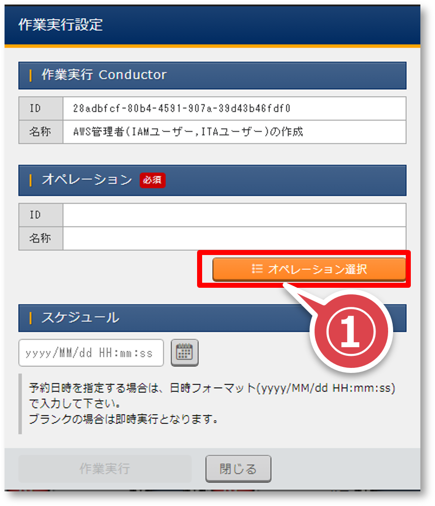 「作業実行設定」ポップアップ画面の「オペレーション選択」ボタンを押下する