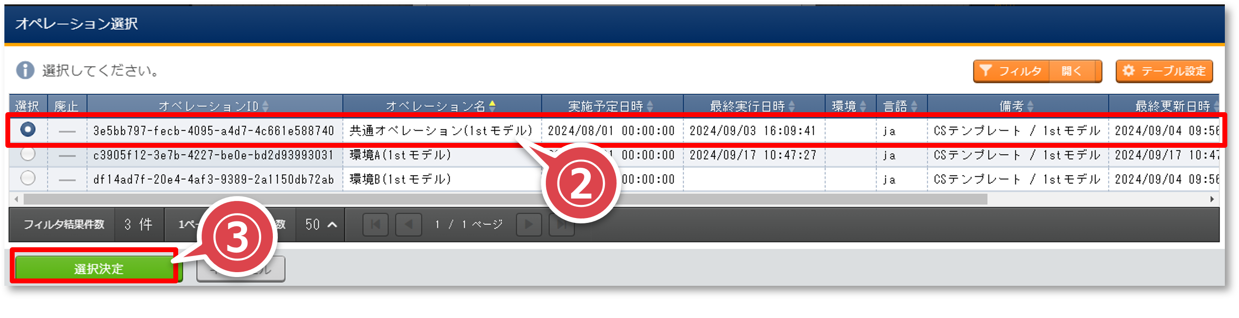 「オペレーション選択」ポップアップ画面の”共通オペレーション”のレコードを選択して「選択決定」ボタンを押下する