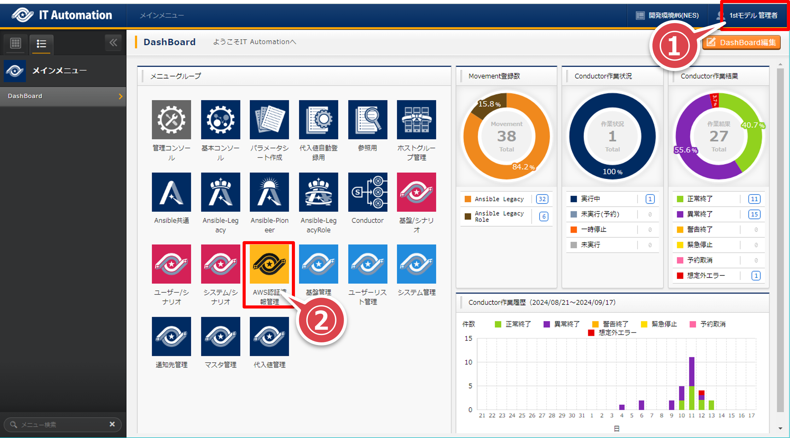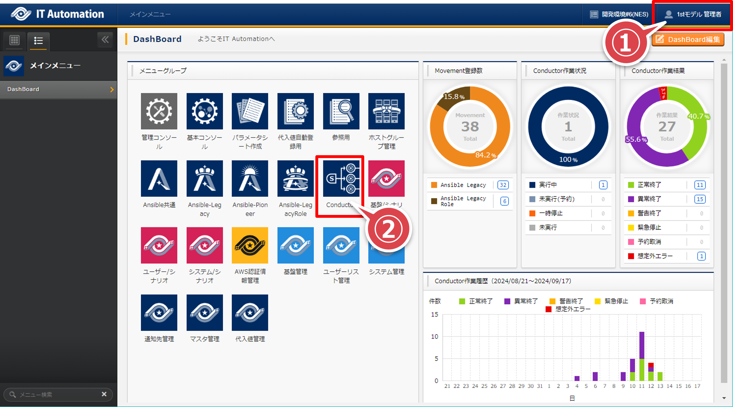 実行者:1stモデル管理者ユーザー名:ita-1st-adminパスワード:passwordメインメニューの「Conductor」アイコンを押下する