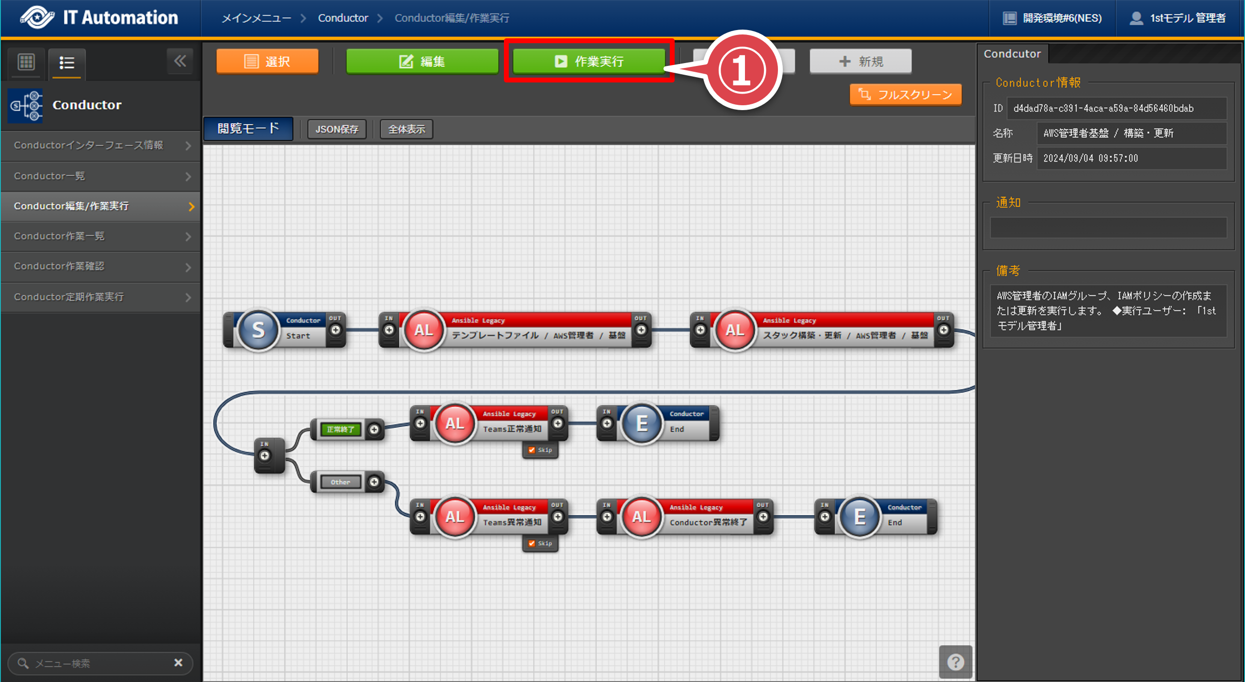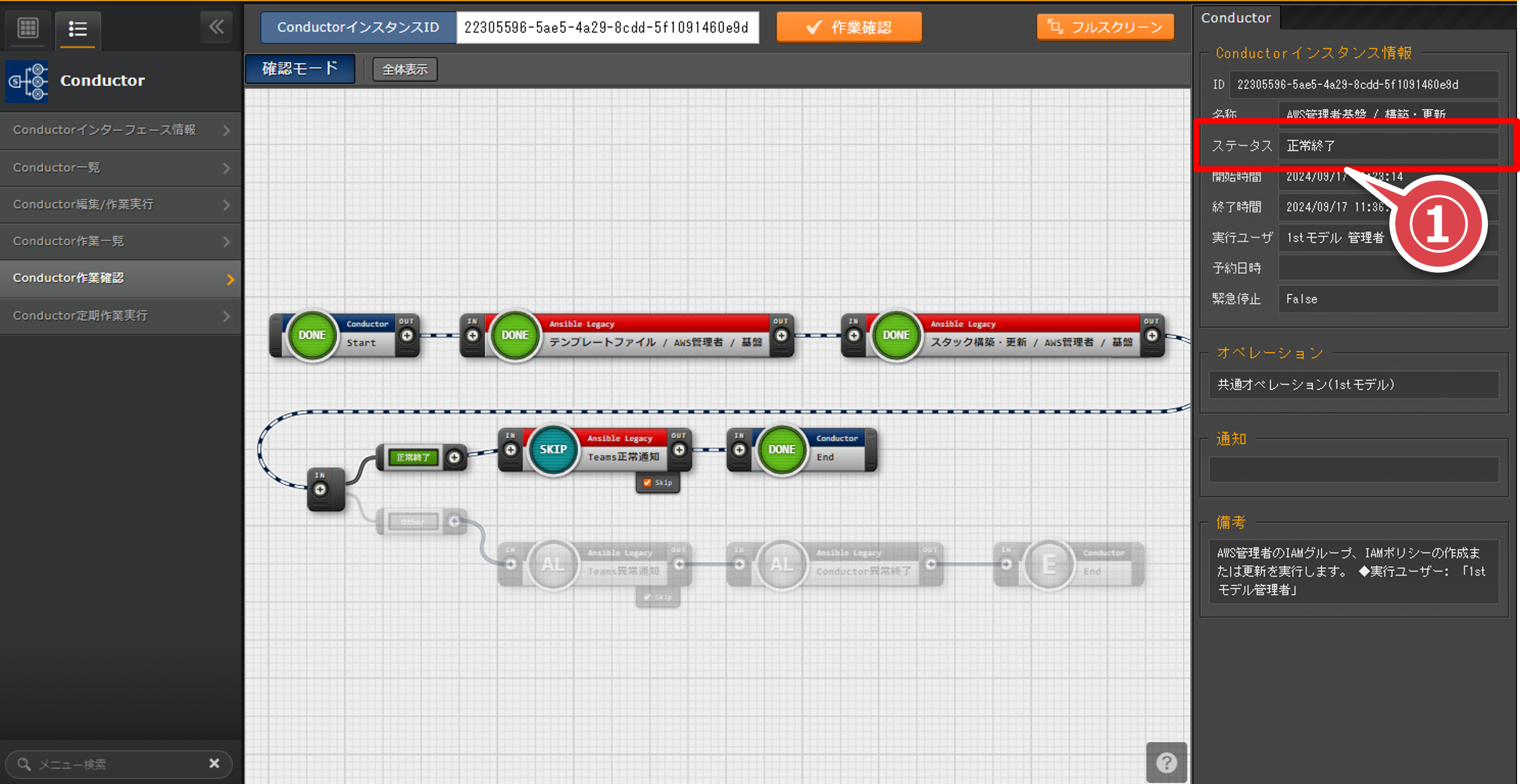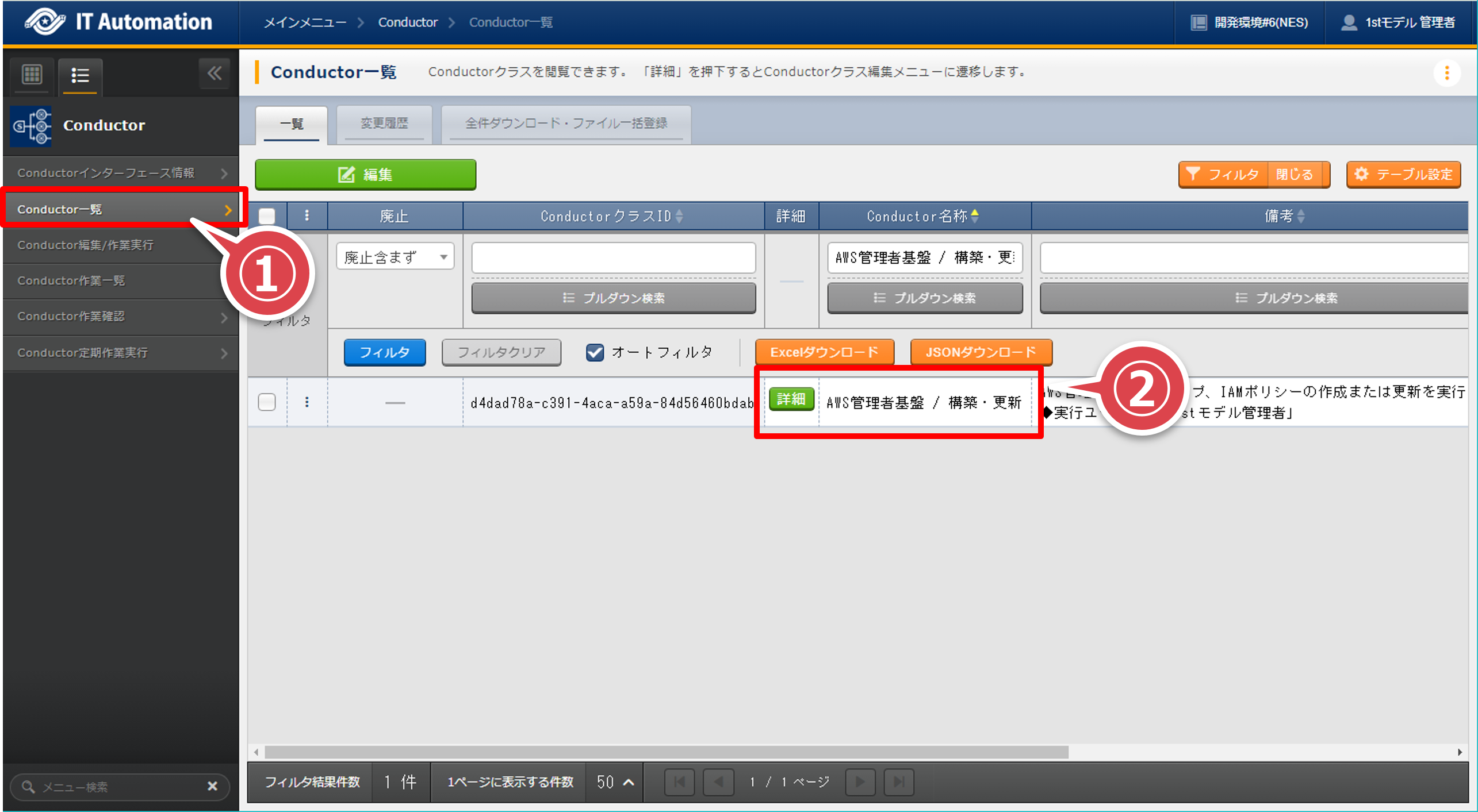- 「Conductor一覧」画面の「Conductor名称」が”AWS管理者基盤 / 構築・更新”のレコードの「詳細」ボタンを押下するフィルタの「Conductor名称」で検索すると間違いがない