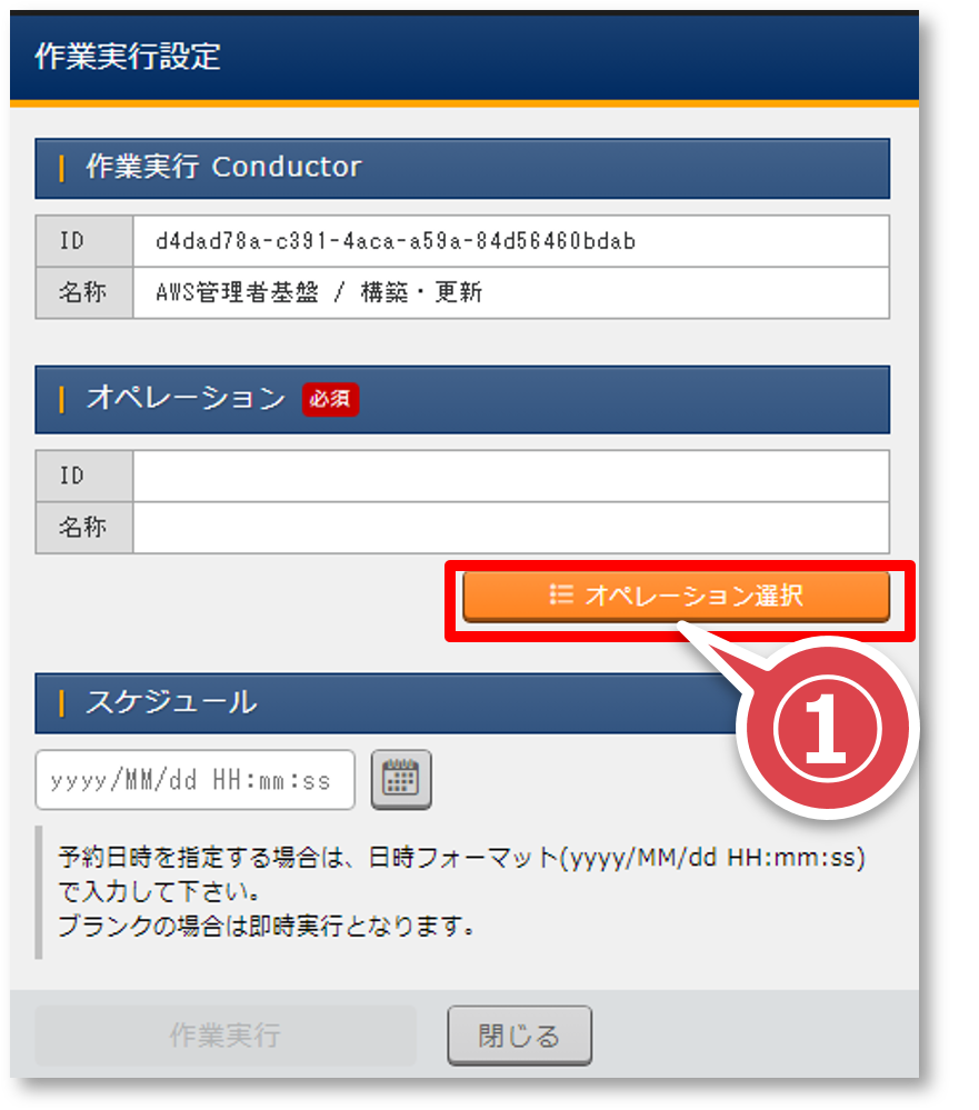 「作業実行設定」ポップアップ画面の「オペレーション選択」ボタンを押下する