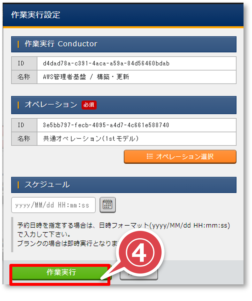 「Conductor編集/作業実行」画面の「作業実行」ボタンを押下する