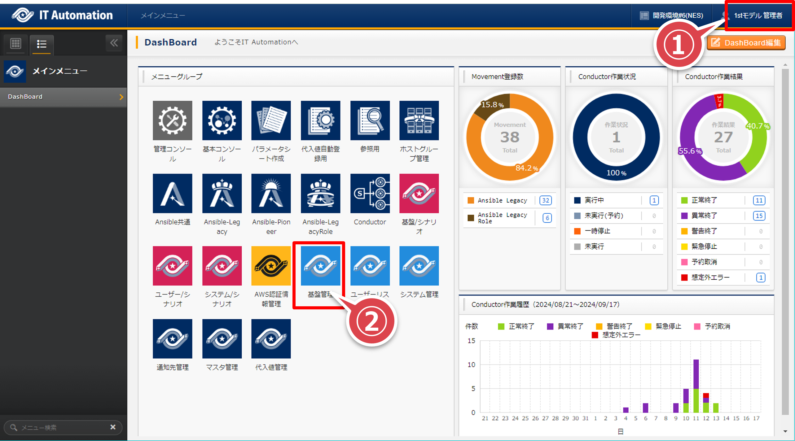 実行者:1stモデル管理者ユーザー名:ita-1st-adminパスワード:passwordメインメニューの「基盤管理」アイコンを押下する