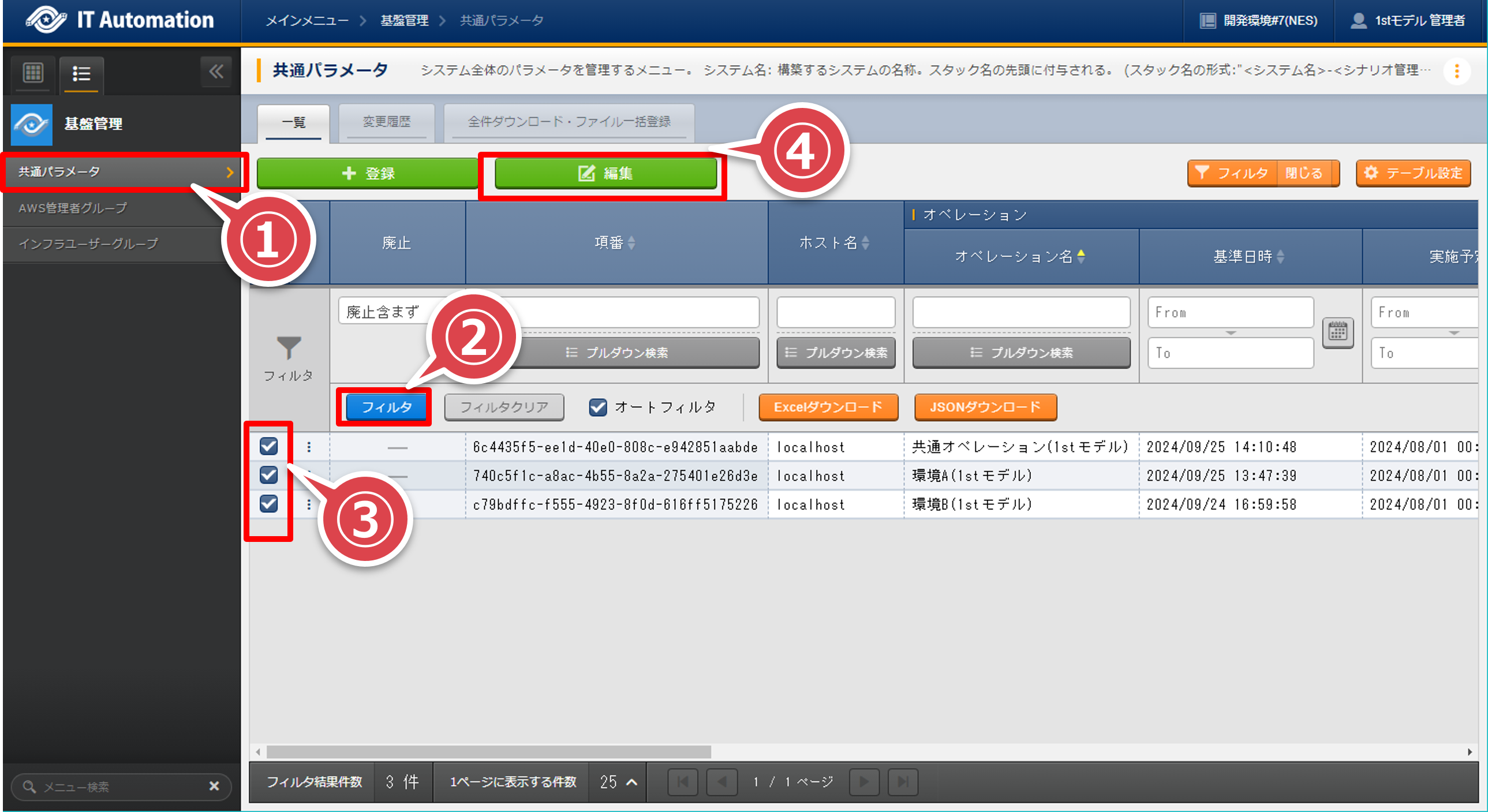「共通パラメータ」へ移動して「フィルタ」ボタンを押下する