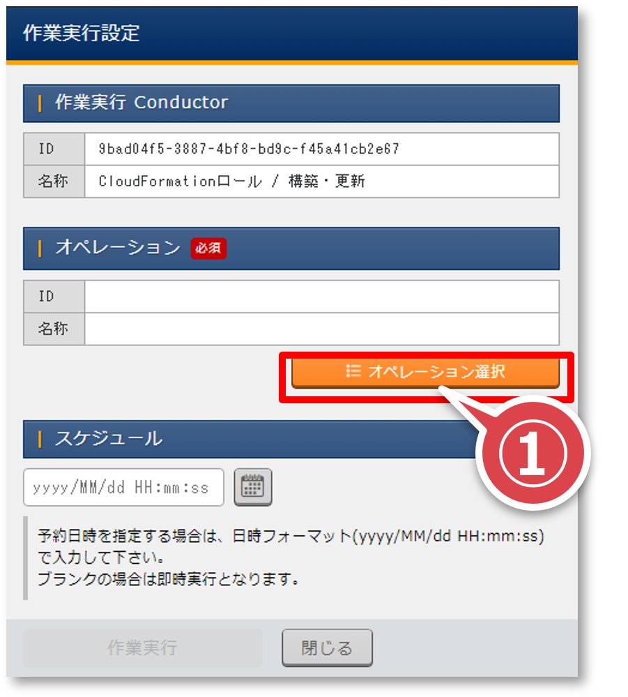 「作業実行設定」ポップアップ画面の「オペレーション選択」ボタンを押下する
