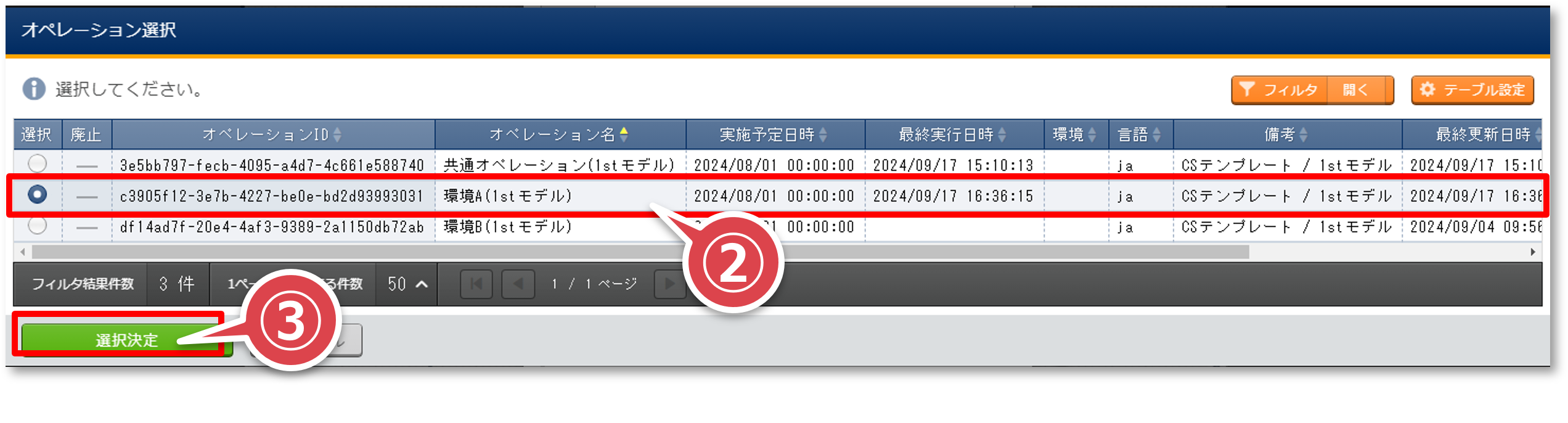 「オペレーション選択」ポップアップ画面の”環境A(1stモデル)”のレコードを選択して「選択決定」ボタンを押下する