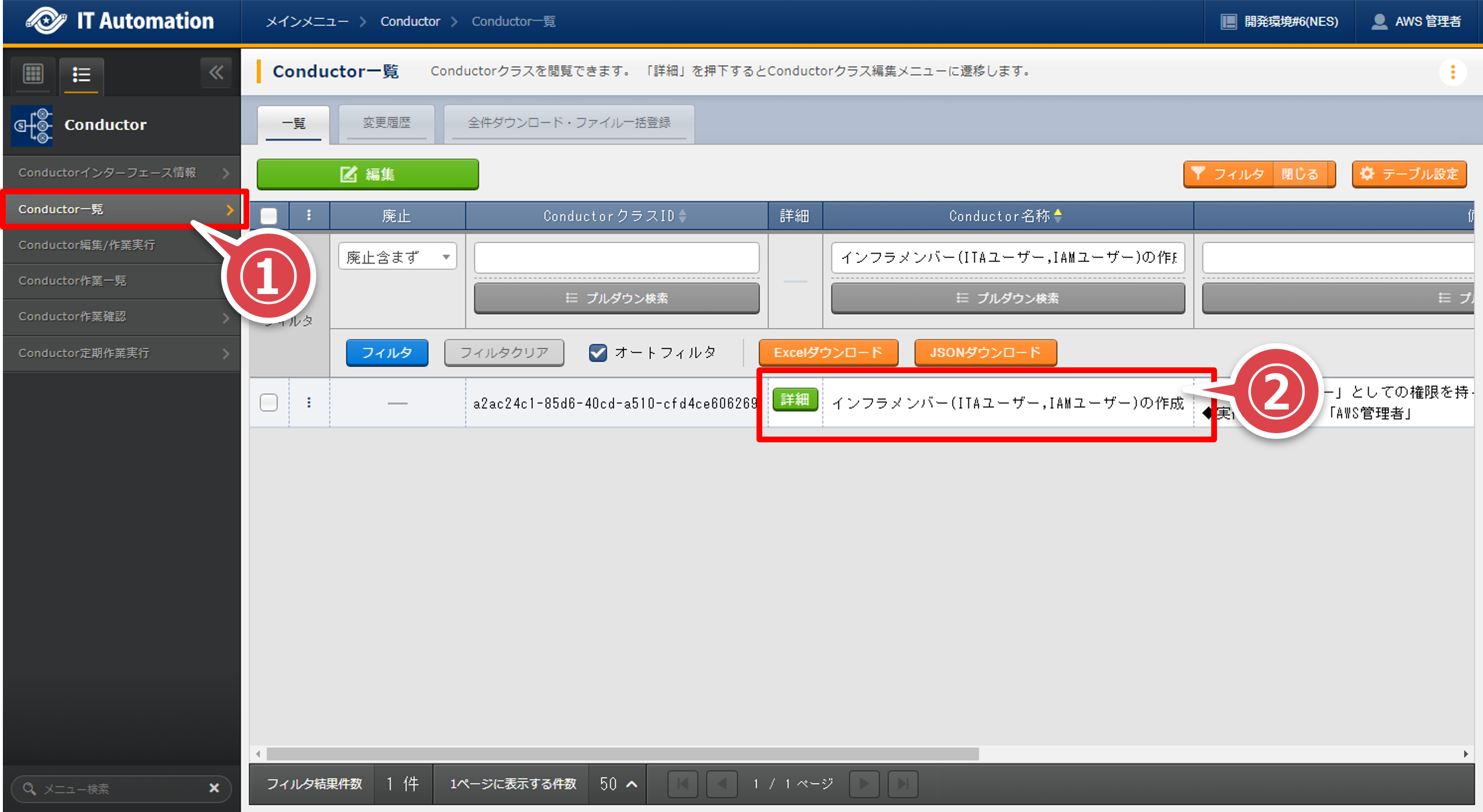 - 「Conductor一覧」画面の「Conductor名称」が”インフラメンバー(ITAユーザー,IAMユーザー)の作成”のレコードの「詳細」ボタンを押下する。フィルタの「Conductor名称」で検索すると間違いがない